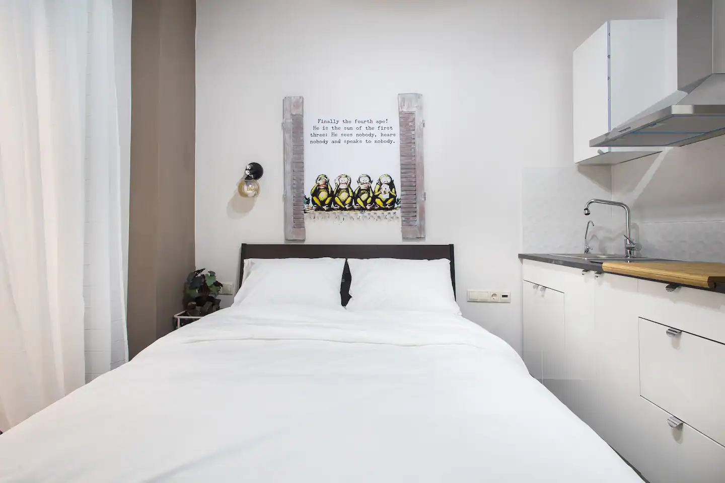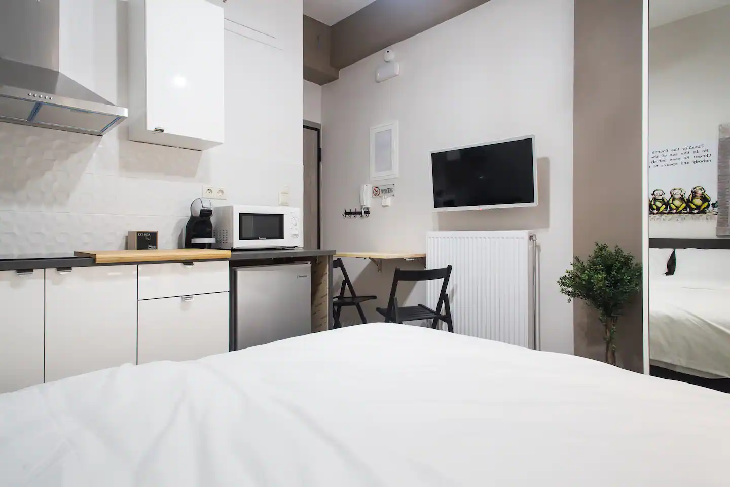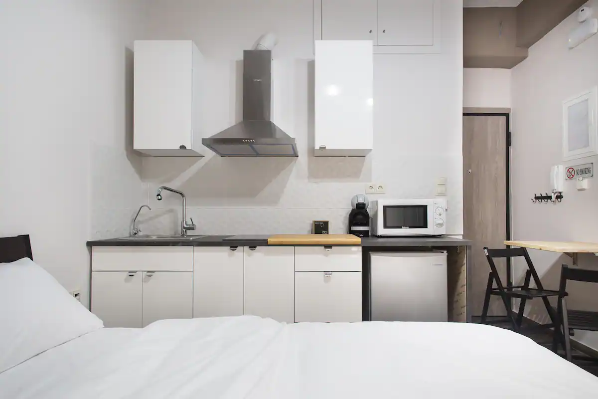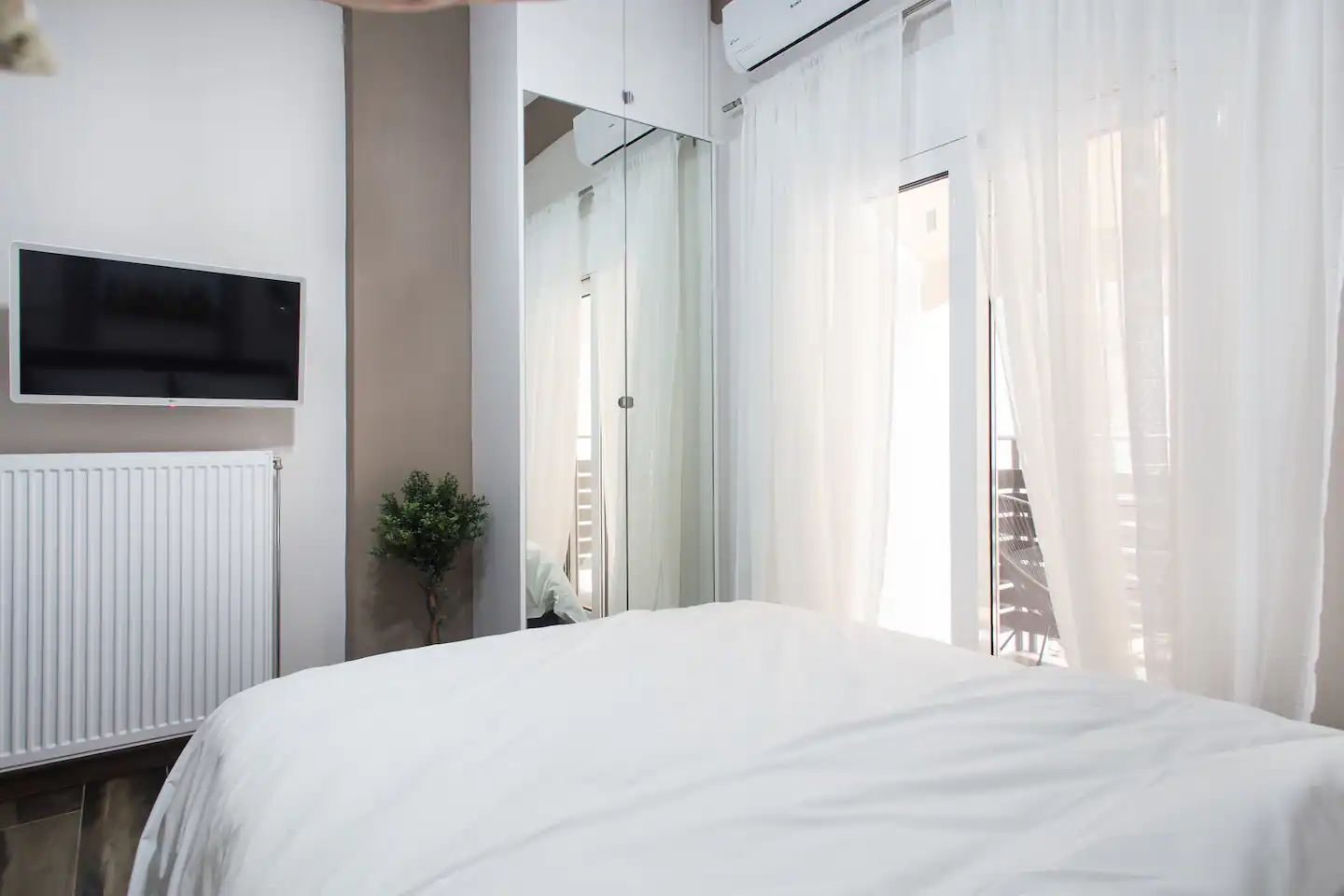 The bathroom has 24h hot water, a 2in1 shampoo/shower gel combo, hand soap, 1 bath towel and 1 guest towel per person. The kitchen includes a fridge/freezer, a microwave, electric hobs and a NESCAFÉ® Dolce Gusto coffee maker (capsules are not provided). Also included will be a starter pack of Greek coffee powder, sugar, salt, pepper and olive oil. In the summer months, blankets are not provided. Instead, we provide a sheet covering. This is common practice in Greece during the summer. The flat is equipped with A/C and a thermostat. In the wardrobe you ‘ll find hangers, an iron and a hair dryer. We have tested the WiFi 🛜 to a confirmed speed of up to 9Mbps.