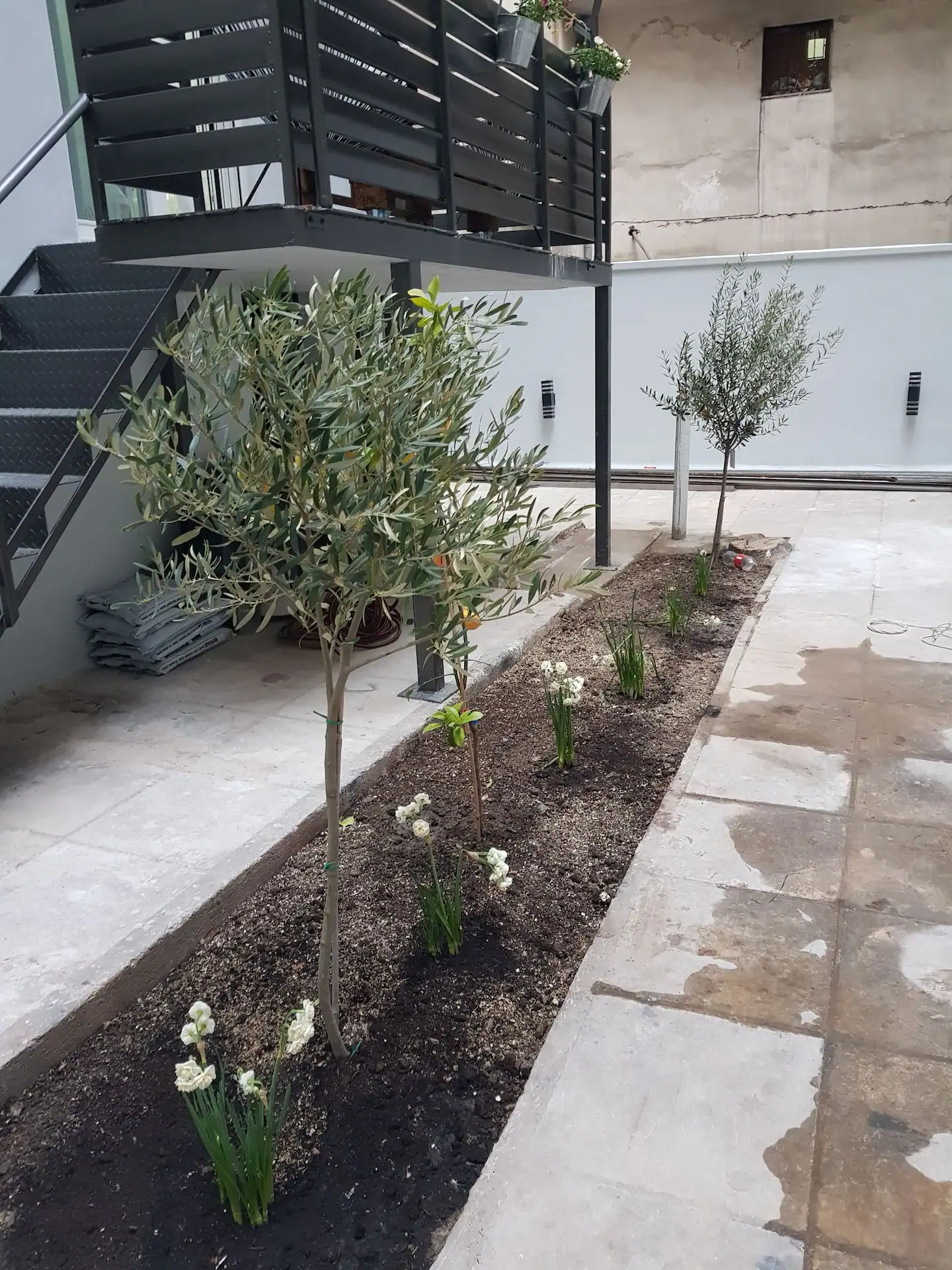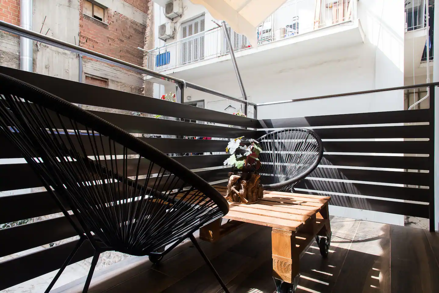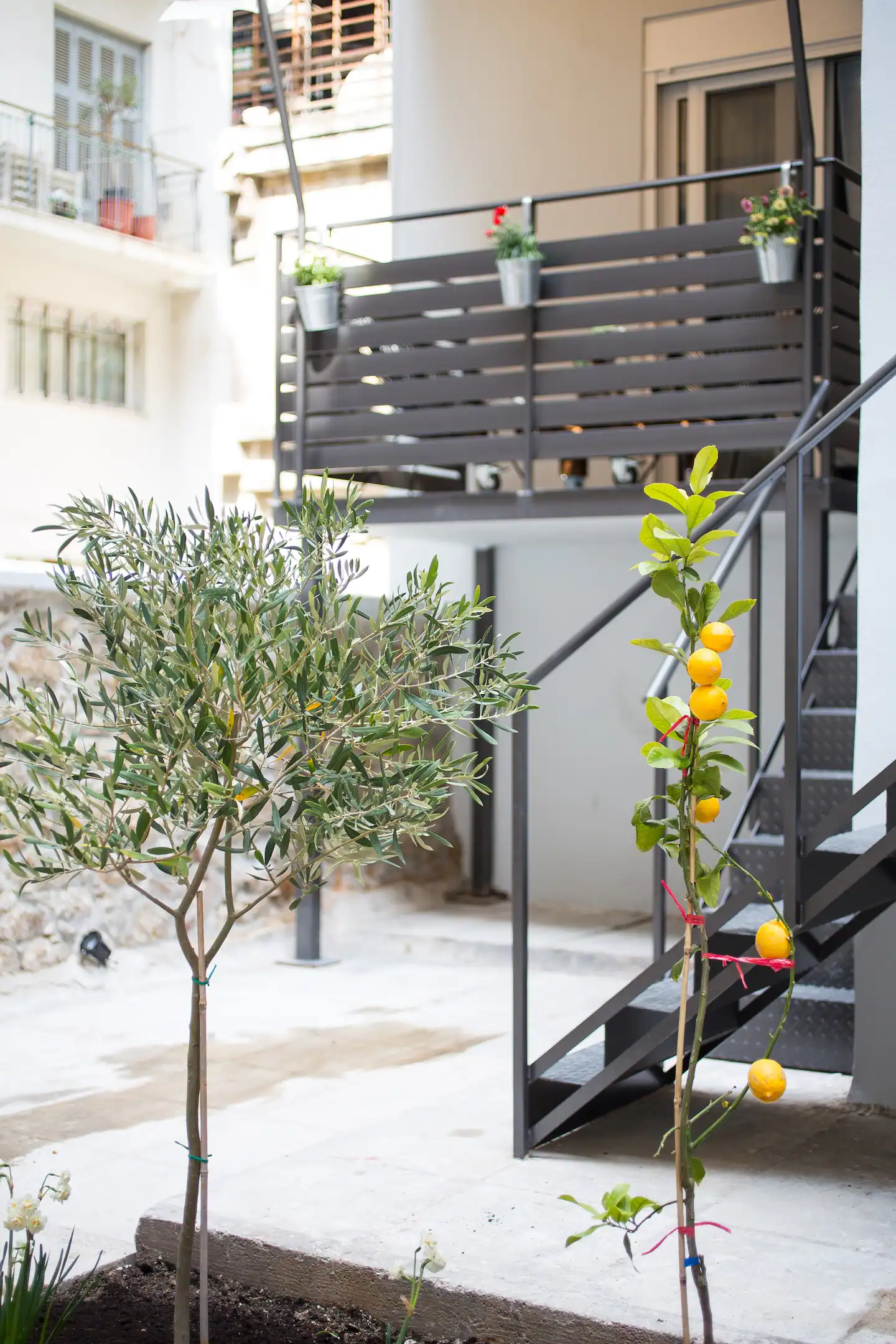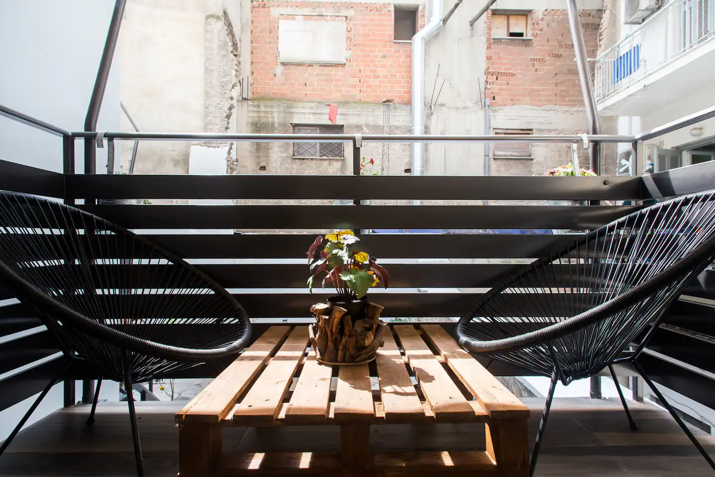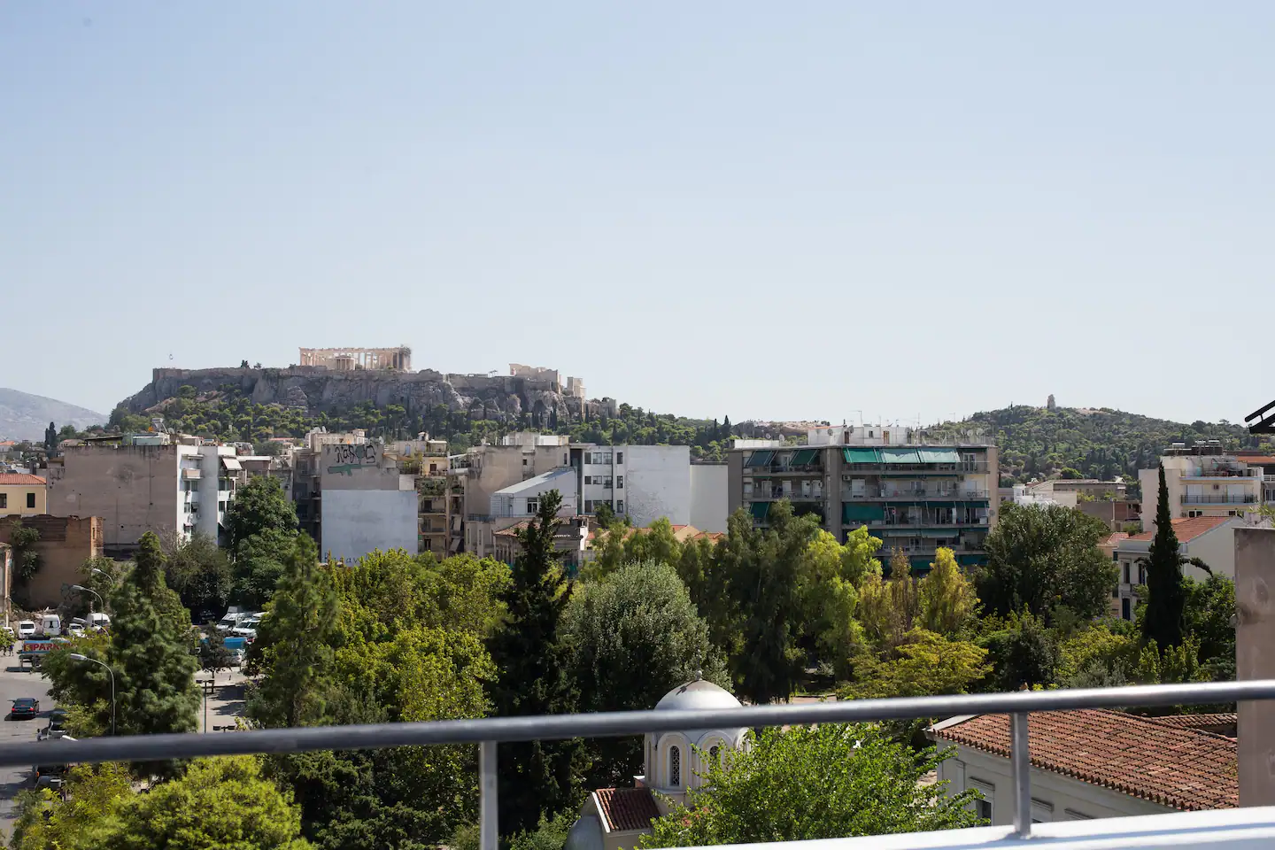 There ‘s a cozy private terrace with outdoor seating for 2 people. On the ground floor of the building you ‘ll find a shared washing machine (€4 per use). Take the 1st lift to the top floor 🔝 to experience our spectacular communal rooftop terrace where you can gaze at an all-embracing Acropolis, Mount Lycabettus and the rest of Athens below!
