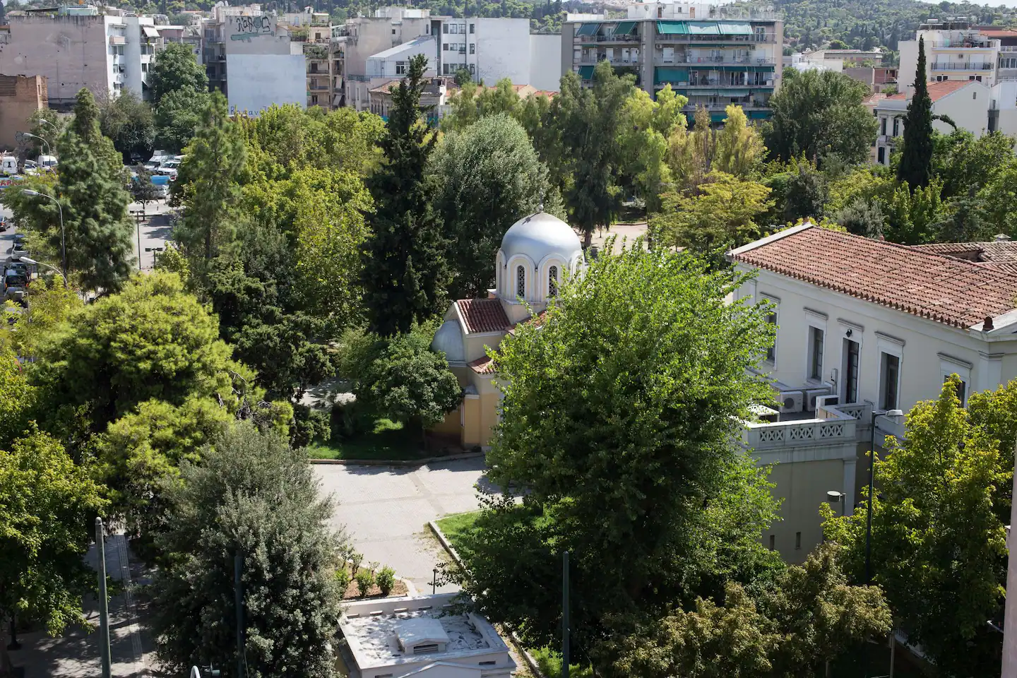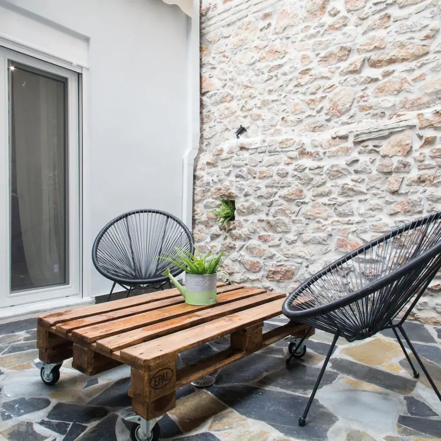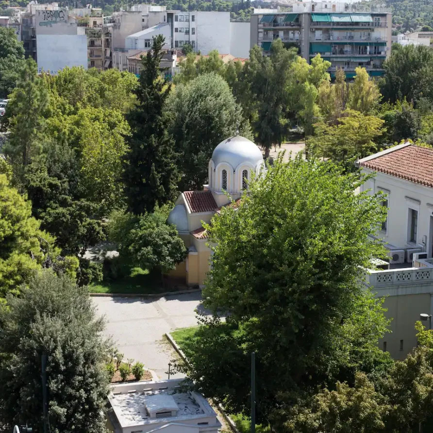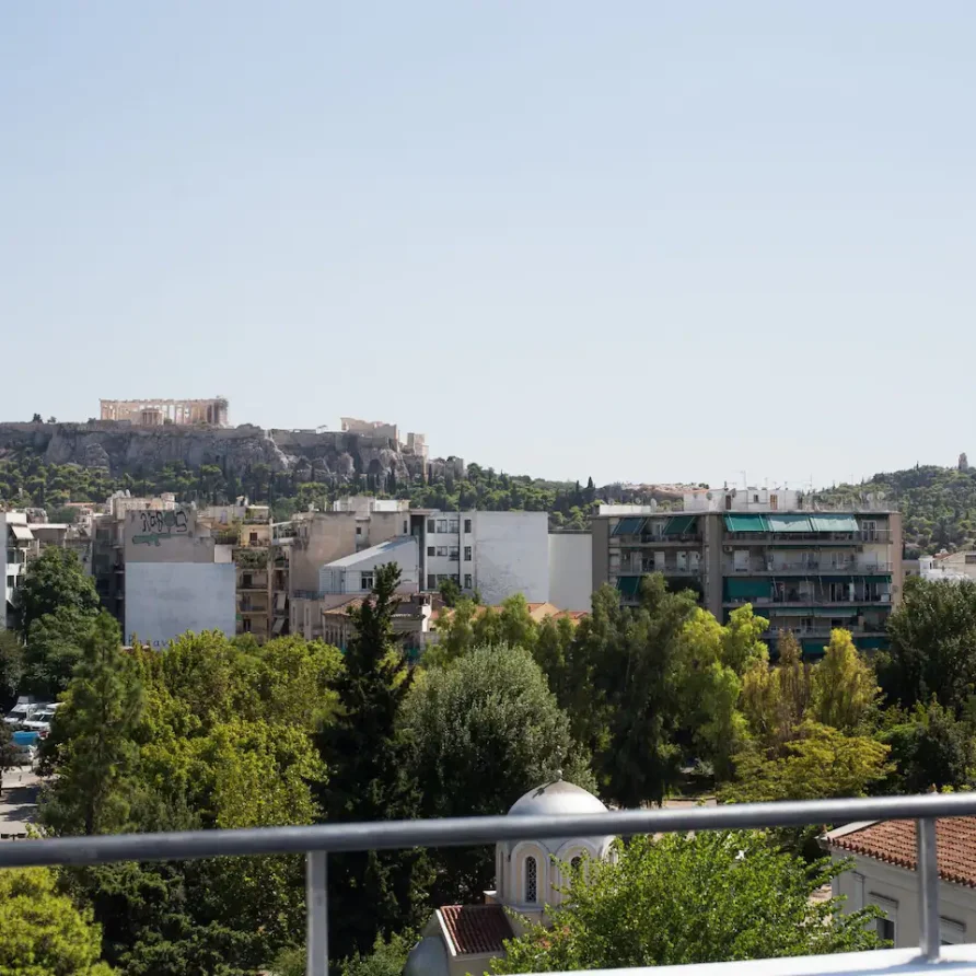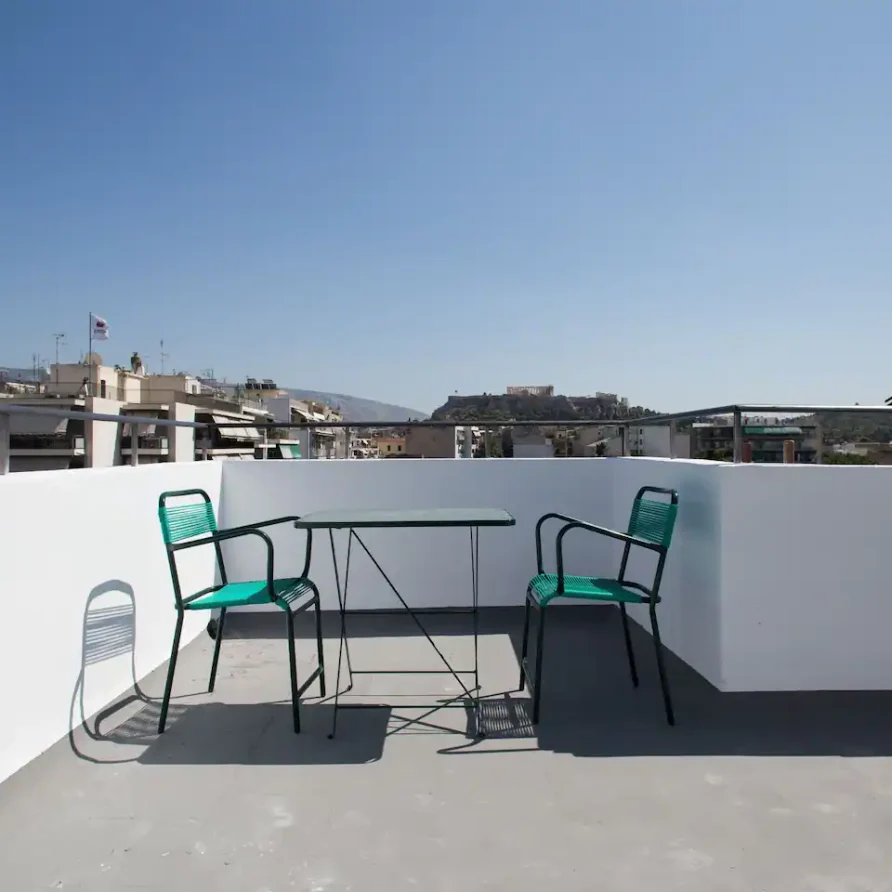 There ‘s a cozy private terrace with outdoor seating for 2 people. Take the 1st lift to the top floor 🔝 to experience our spectacular communal rooftop terrace where you can gaze at an all-embracing Acropolis, Mount Lycabettus and the rest of Athens below!