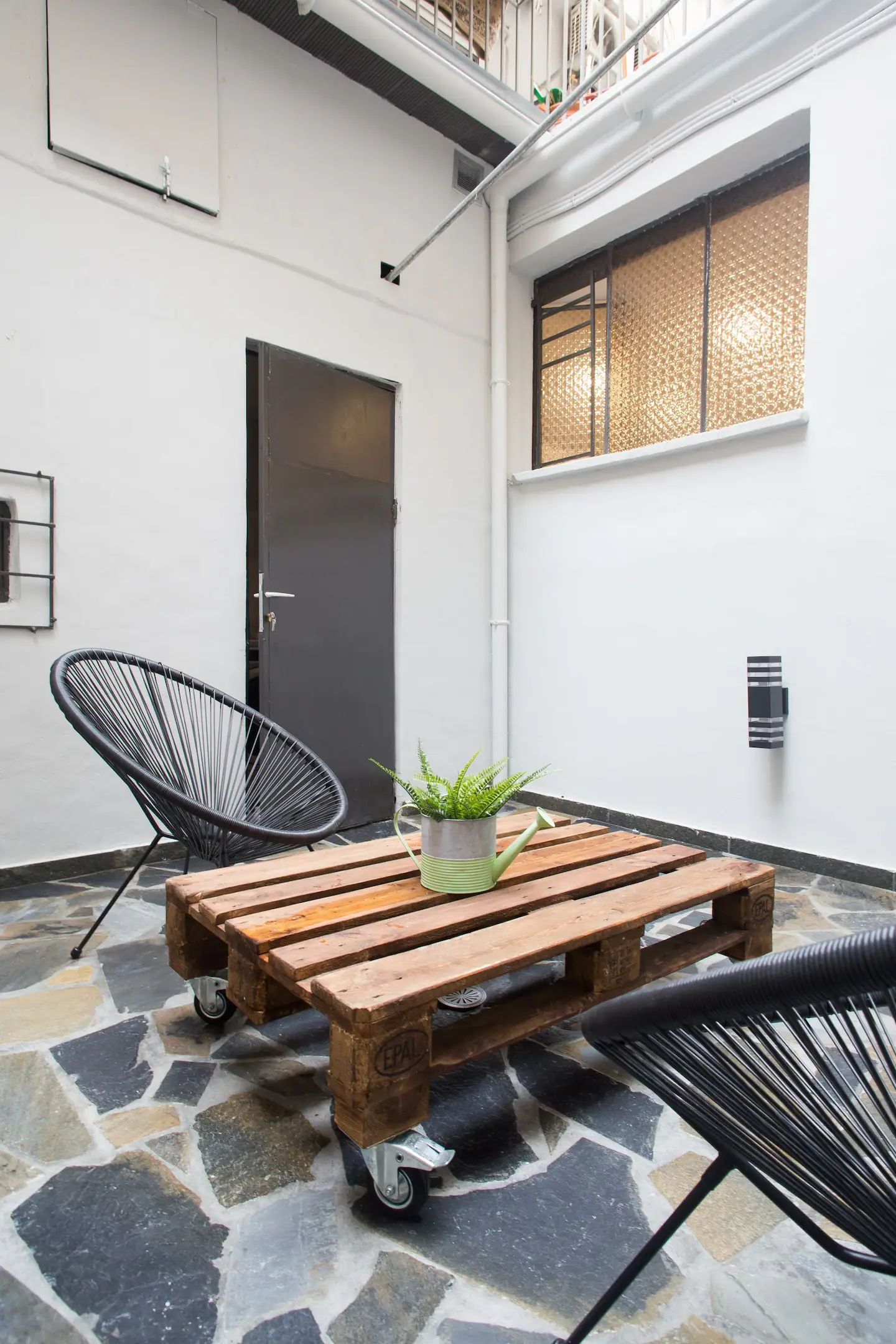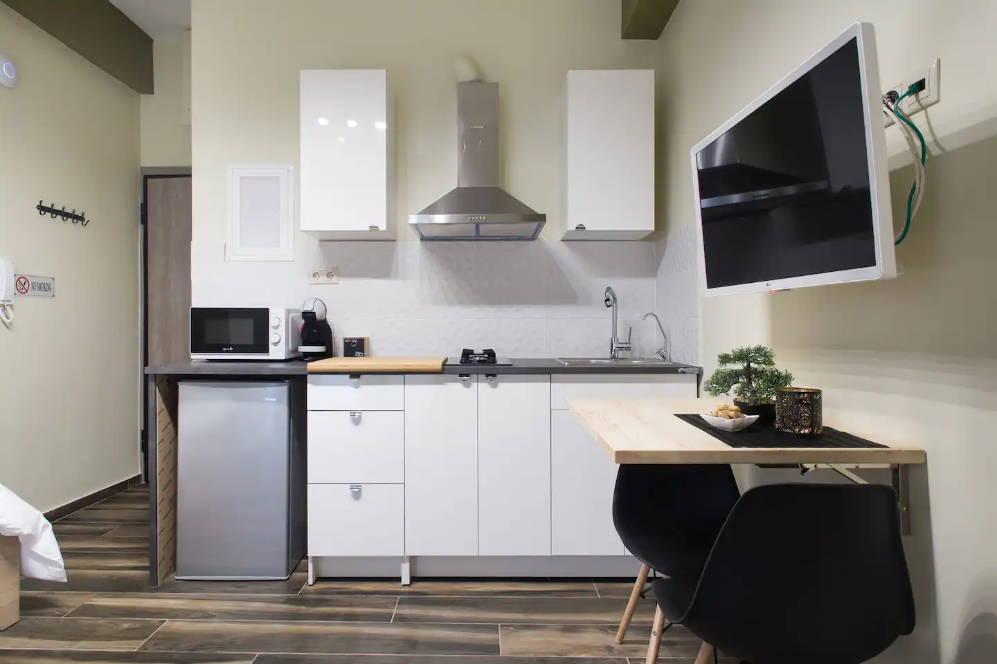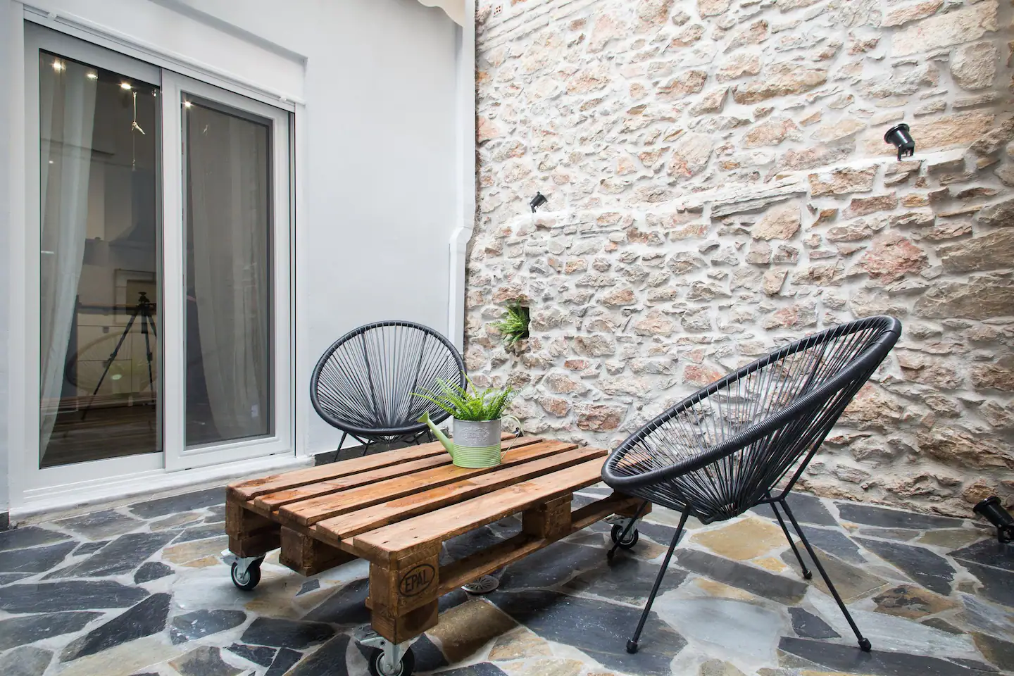18m² apartment on the ground floor in the Kerameikos area featuring one double bed, a fully equipped bathroom, a full kitchen with gas hobs, and a private terrace. There ‘s an HDTV (streaming service accounts not provided) and suitable sleeping space for up to 2 people. Only a short walk from Ermou, Monastiraki & Thissio.