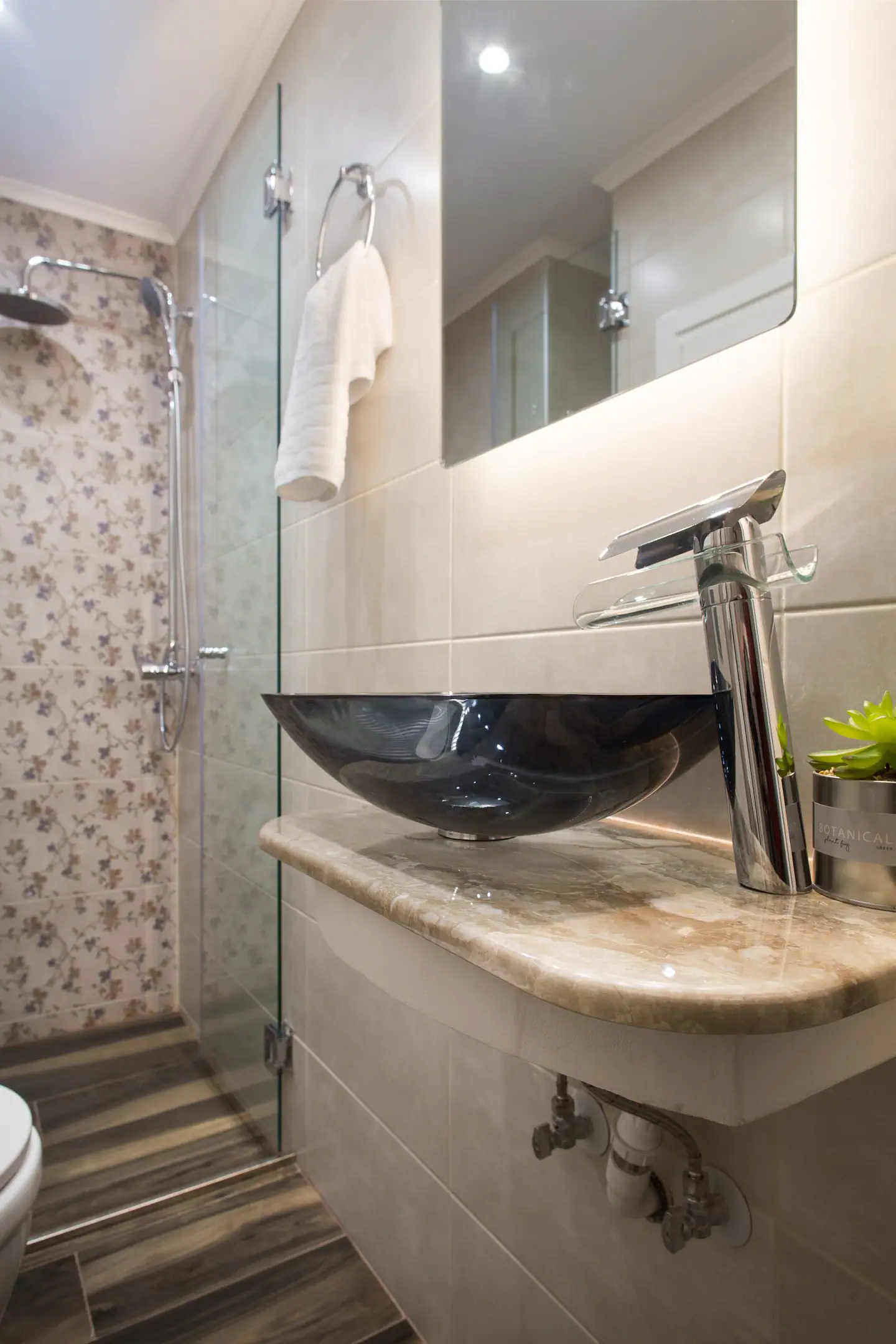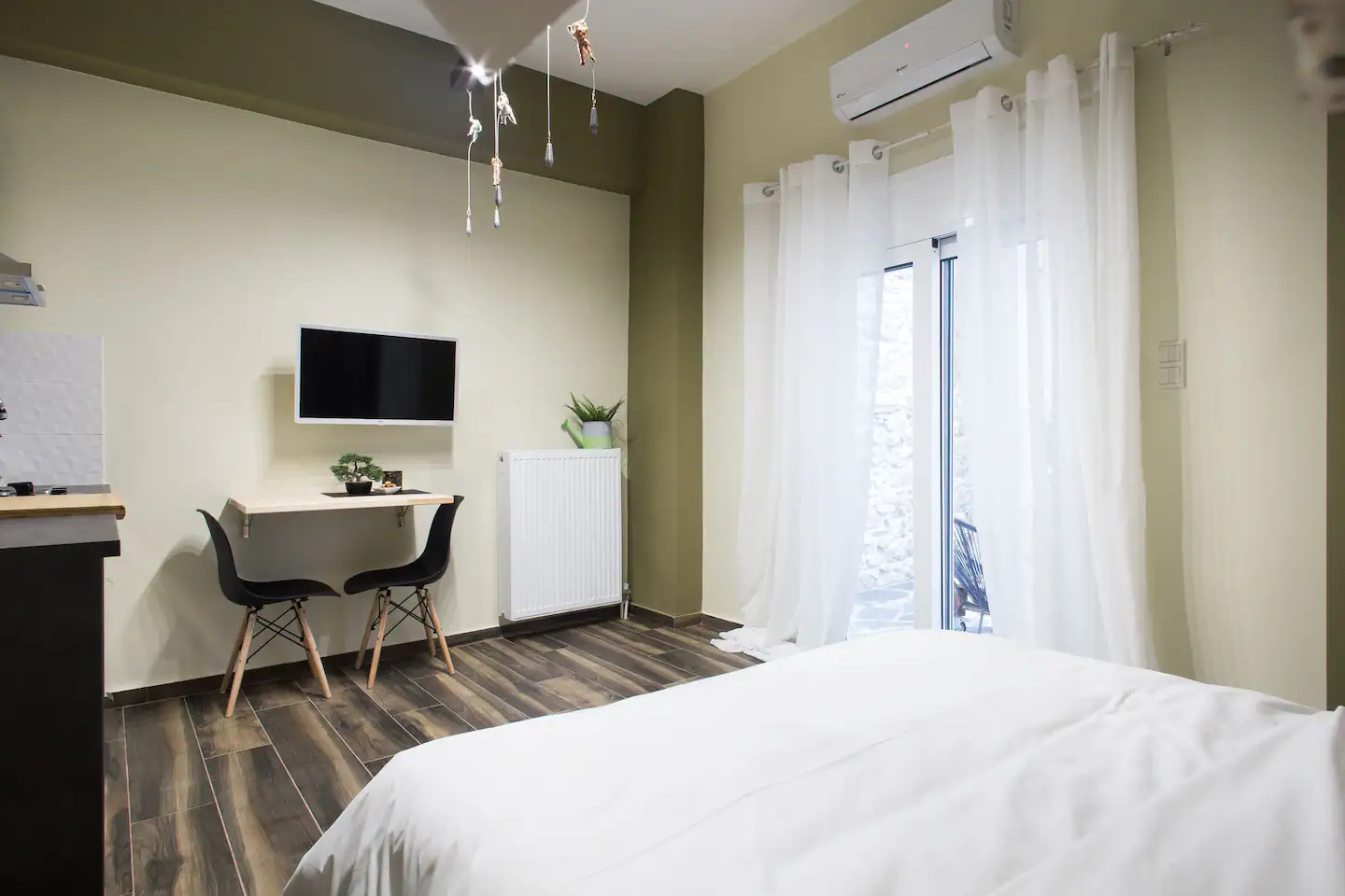 The bathroom has 24h hot water, a 2in1 shampoo/shower gel combo, hand soap, 1 bath towel and 1 guest towel per person. The kitchen includes a fridge/freezer, a microwave, gas hobs and a NESCAFÉ® Dolce Gusto coffee maker ☕️ (capsules are not provided). Also included will be a starter pack of Greek coffee powder, sugar, salt, pepper and olive oil. In the summer months, blankets are not provided. Instead, we provide a sheet covering. This is common practice in Greece during the summer. The flat is equipped with A/C and a thermostat. In the wardrobe you ‘ll find hangers, an iron and a hair dryer. We have tested the WiFi 🛜 to a confirmed speed of up to 9Mbps.