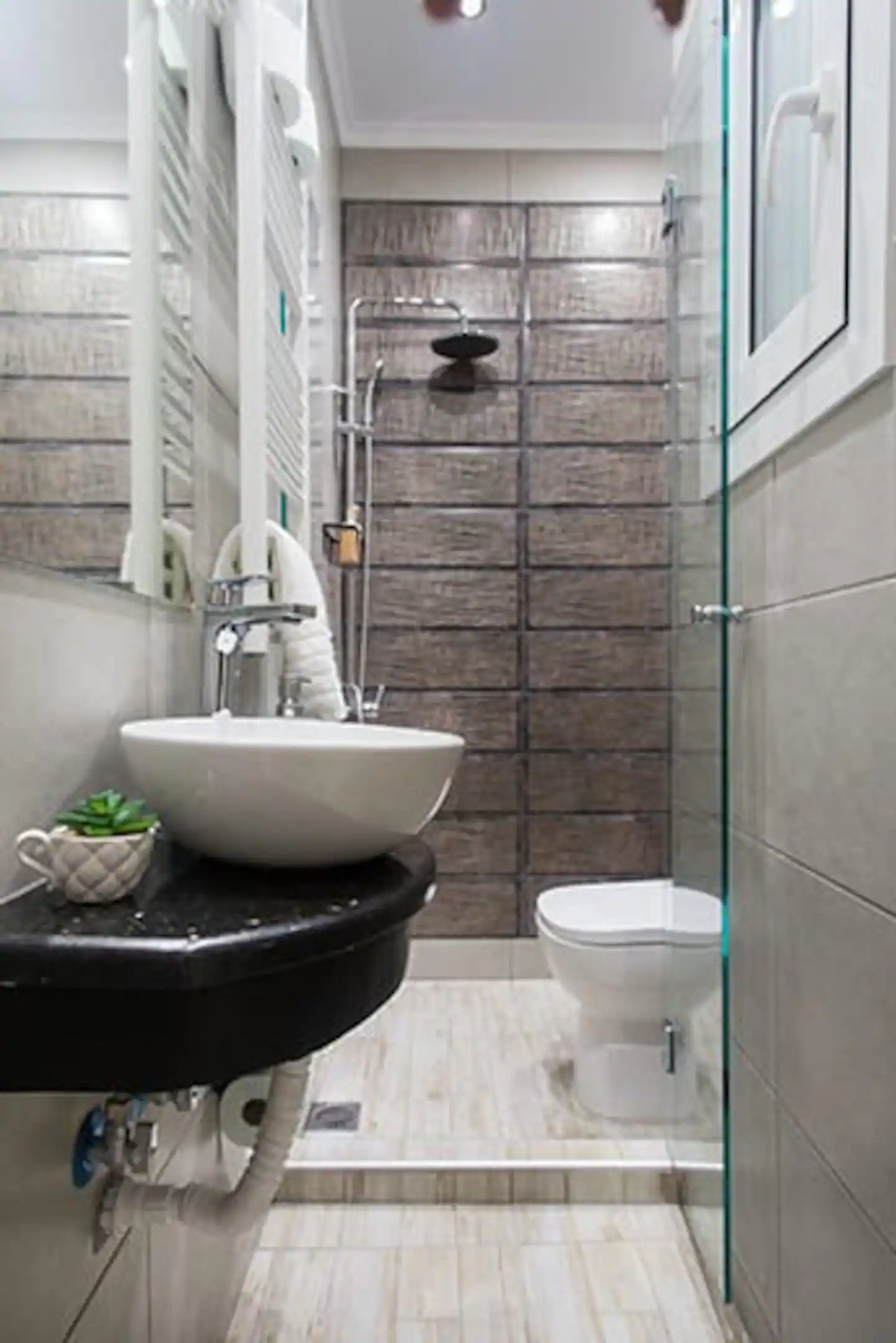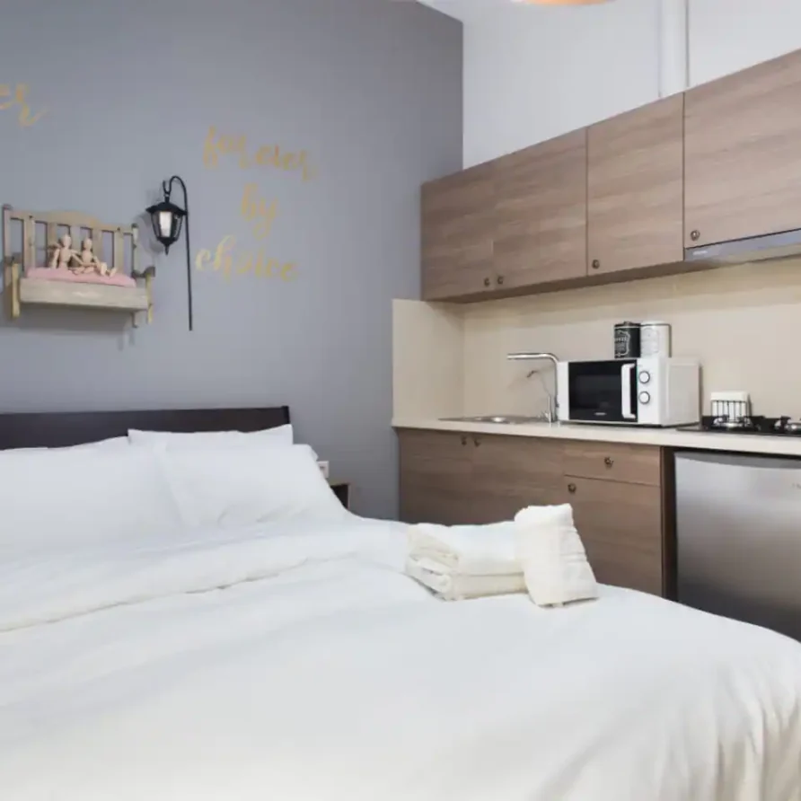 Elbows in! These are tight quarters and I would say it is best suited for a solo, low-maintenance traveler like myself. One person’s luggage will fill the space and leave little room for anyone or anything else. There is a kitchenette, but it’s a mere three feet from the edge of the bed. The bathroom is narrow as well, so much so that the toilet is actually in the shower. Heaven’t seen that one before, but then again, you can only work with the space you have and they’ve done a good job with it. Having said that, the shower is fantastic, the bed comfortable, the unit clean and looks newly renovated, towels clean and fresh, and the hosts are incredibly professional and responsive. It can be a good deal if all you need is a place to lay your head at night. Convenient and walkable to all the main areas of center Athens.
