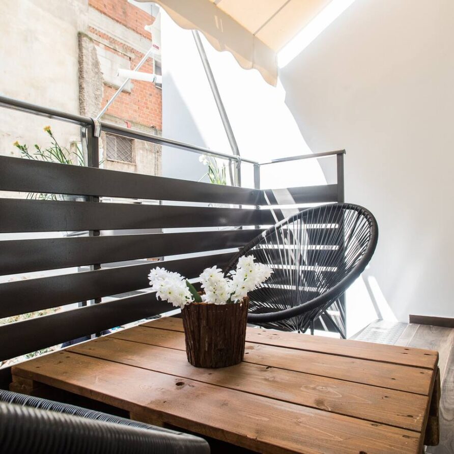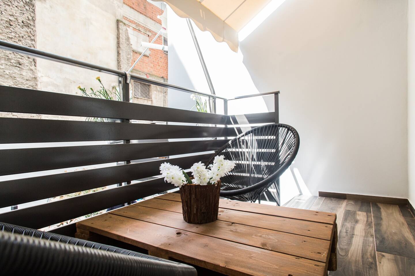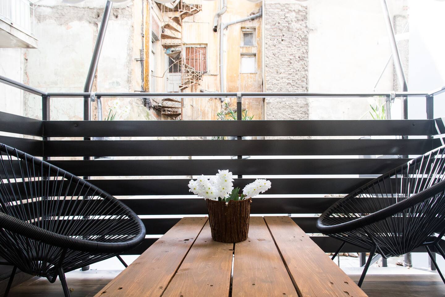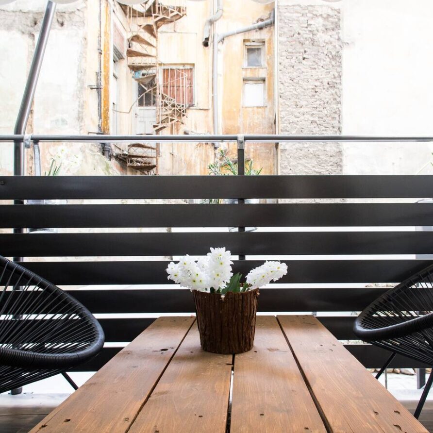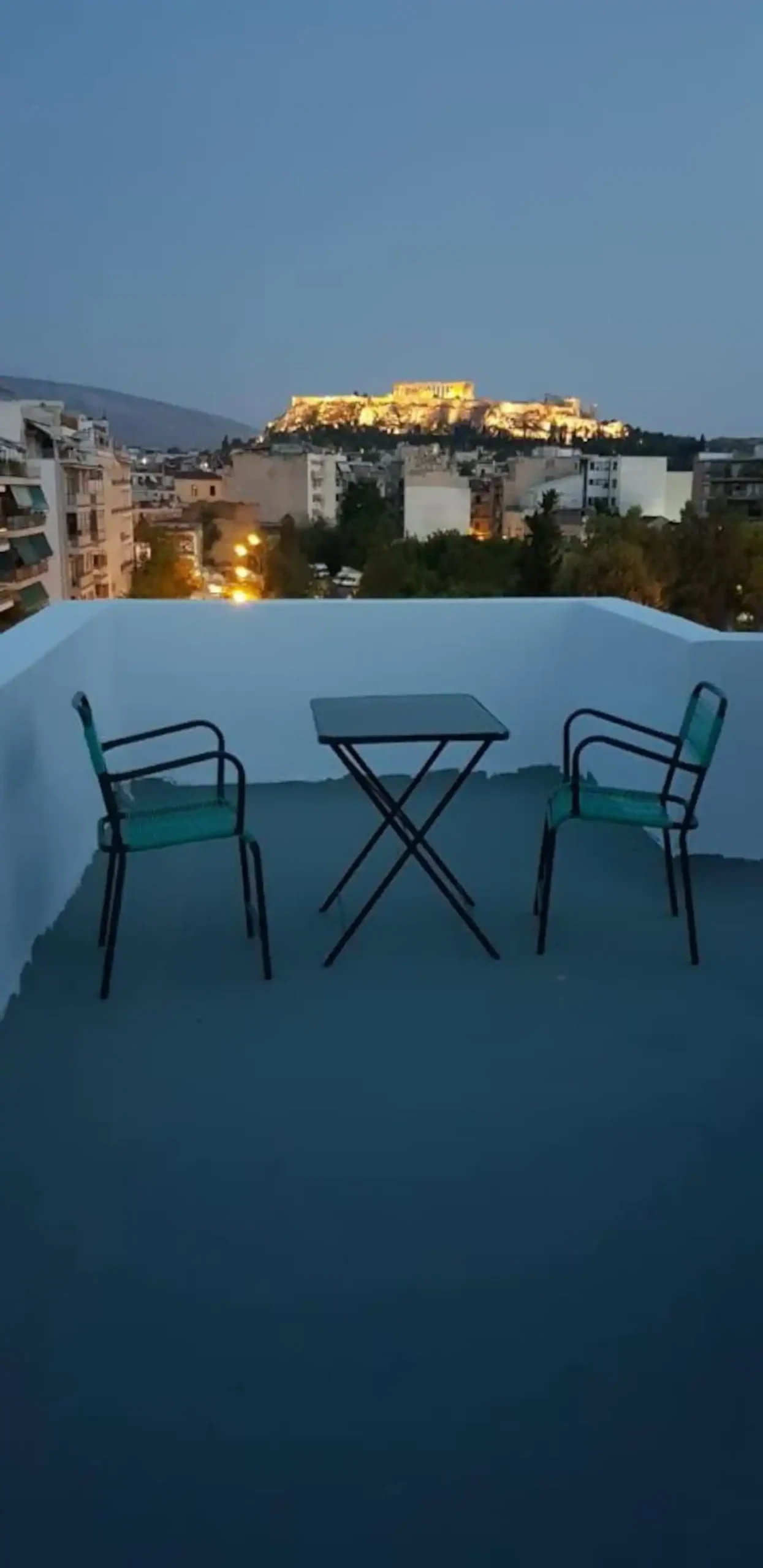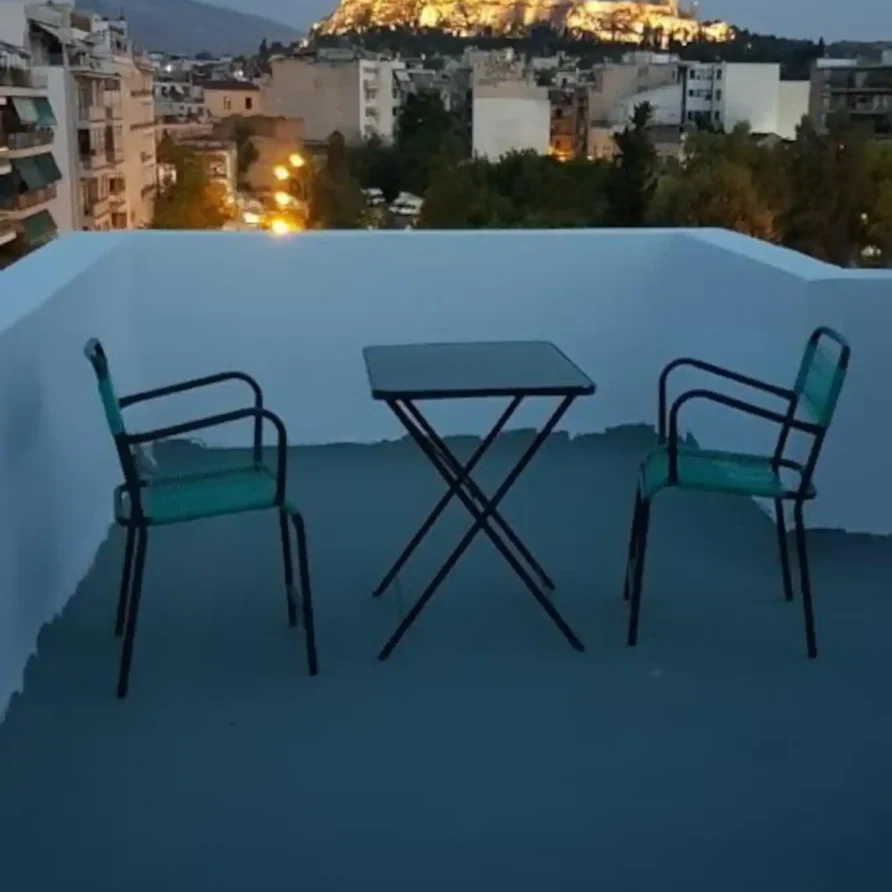 There ‘s a cozy private terrace with outdoor seating for 2 people. Take the 1st lift to the top floor to experience our spectacular communal rooftop terrace where you can gaze at an all-embracing Acropolis, Mount Lycabettus and the rest of Athens below!