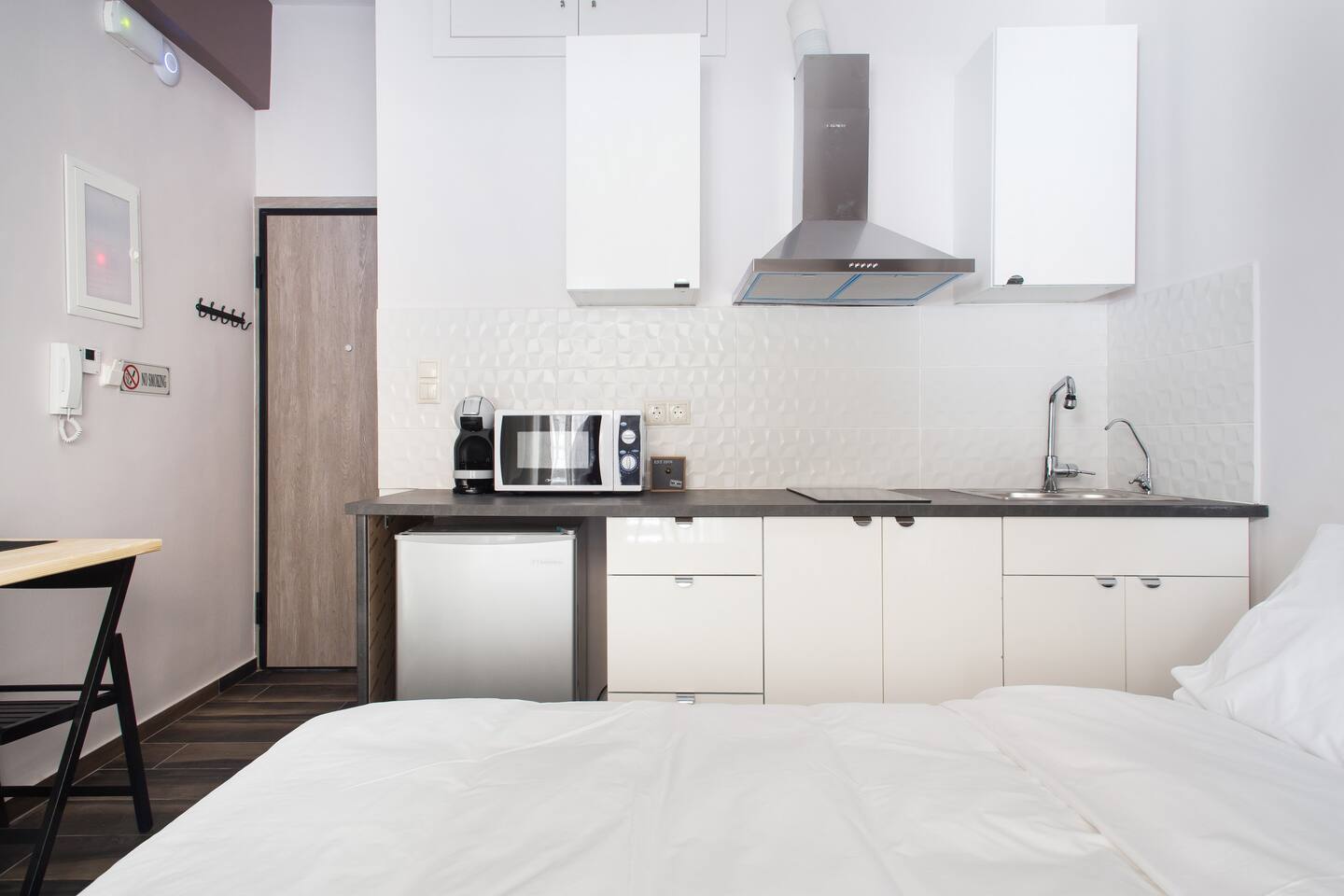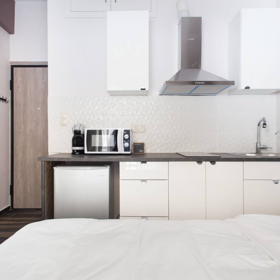 18m² apartment on the ground floor in the Kerameikos area featuring one double bed, a fully equipped bathroom, a full kitchen with gas hobs, and a private terrace. There ‘s an HDTV (streaming service accounts not provided) and suitable sleeping space for up to 2 people. Only a short walk from Ermou, Monastiraki & Thissio.