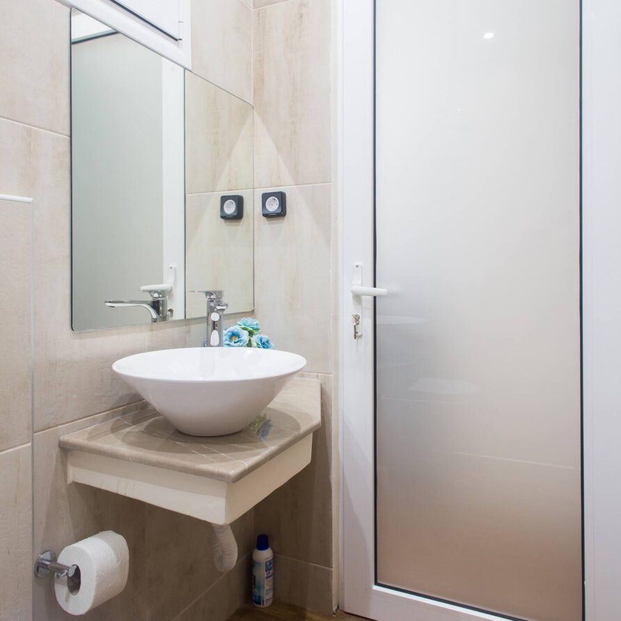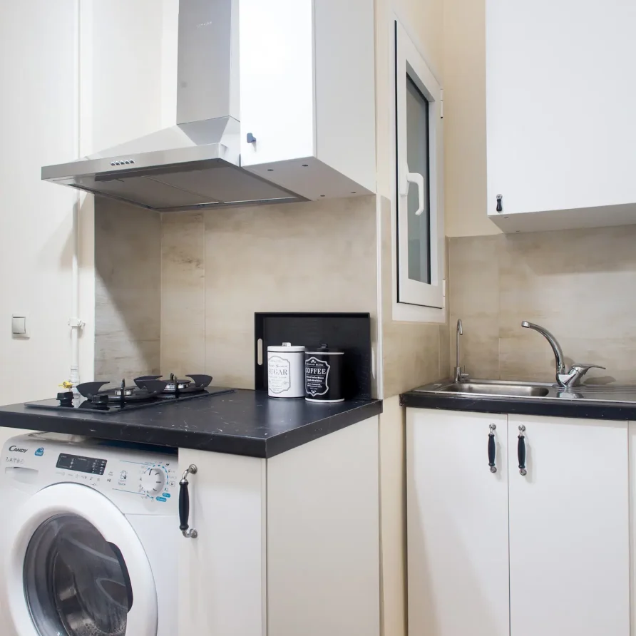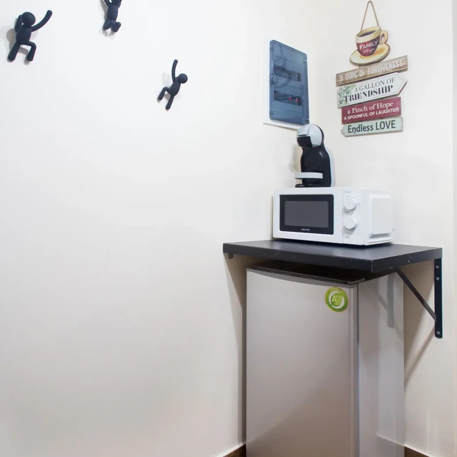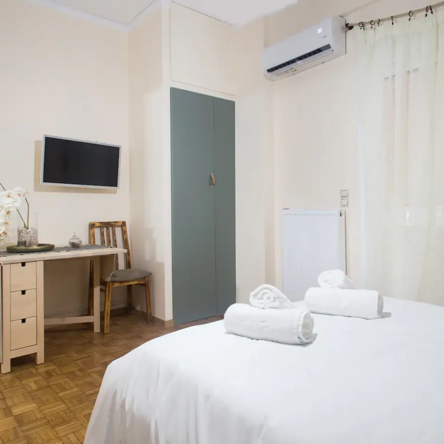 The bathroom has 24h hot water, a 2in1 shampoo/shower gel combo, hand soap, 1 bath towel and 1 guest towel per person. The kitchen includes a fridge/freezer, a microwave, gas hobs, and a NESCAFÉ® Dolce Gusto coffee maker (capsules are not provided). Also included will be a starter pack of Greek coffee powder, sugar, salt, pepper and olive oil. In the summer months, blankets are not provided. Instead, we provide a sheet covering. This is common practice in Greece during the summer. The flat is equipped with A/C. In the wardrobe you ‘ll find hangers, an iron and a hair dryer.