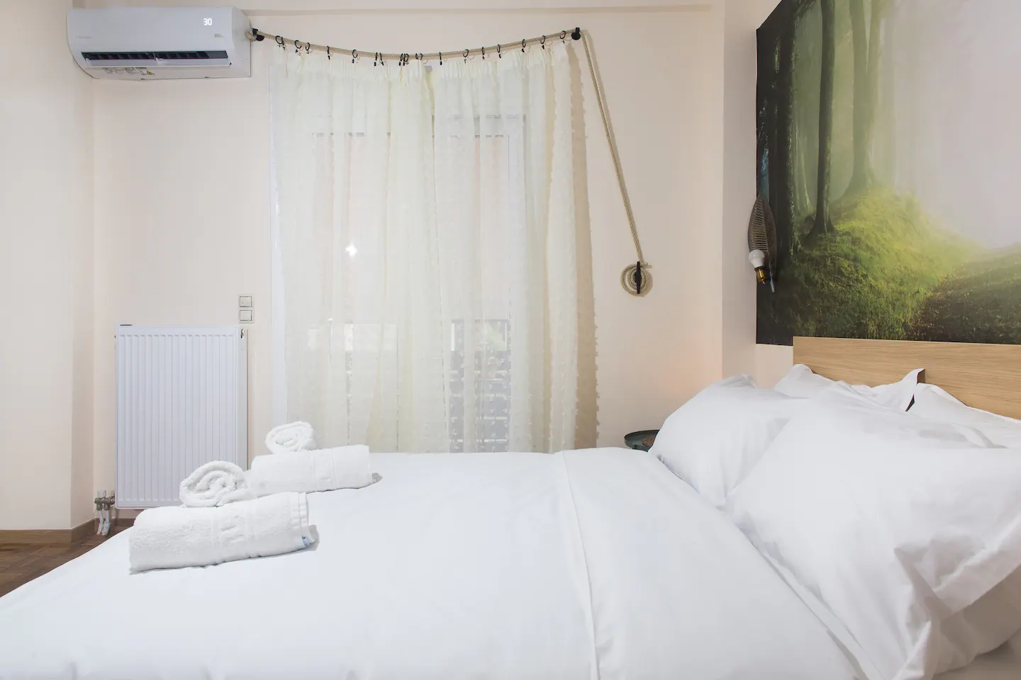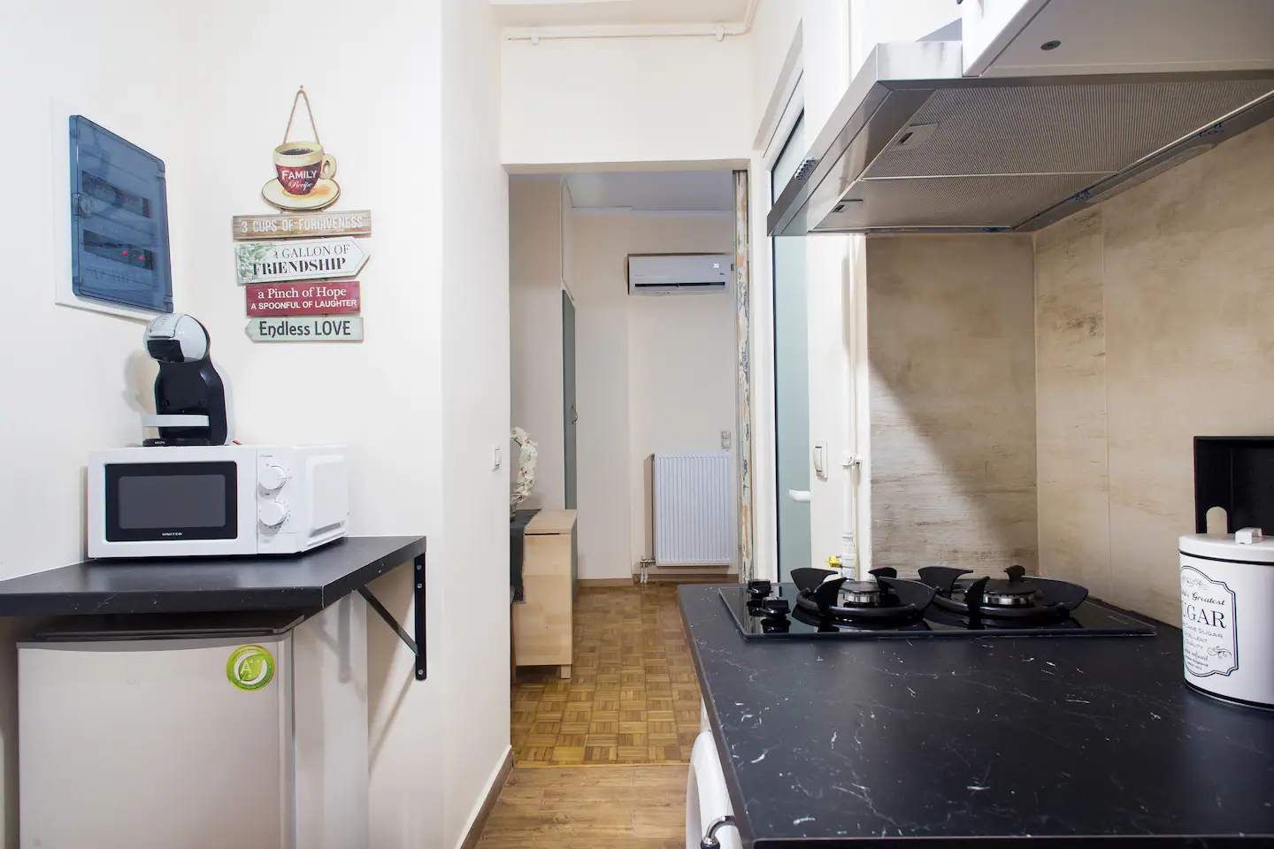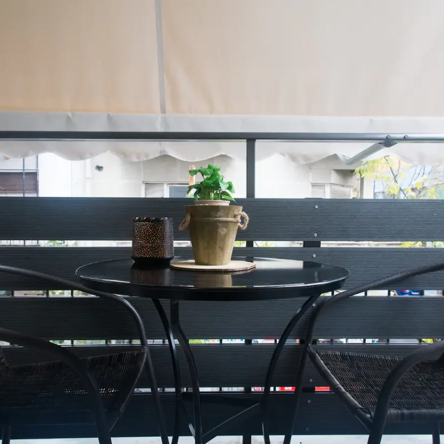 The bathroom has 24h hot water, a 2in1 shampoo/shower gel combo, hand soap, 1 bath towel and 1 guest towel per person. The kitchen includes a fridge/freezer, a microwave, gas hobs, and a NESCAFÉ® Dolce Gusto coffee maker (capsules are not provided). Also included will be a starter pack of Greek coffee powder, sugar, salt, pepper and olive oil. In the summer months, blankets are not provided. Instead, we provide a sheet covering. This is common practice in Greece during the summer. The flat is equipped with A/C. In the wardrobe you ‘ll find hangers, an iron and a hair dryer.