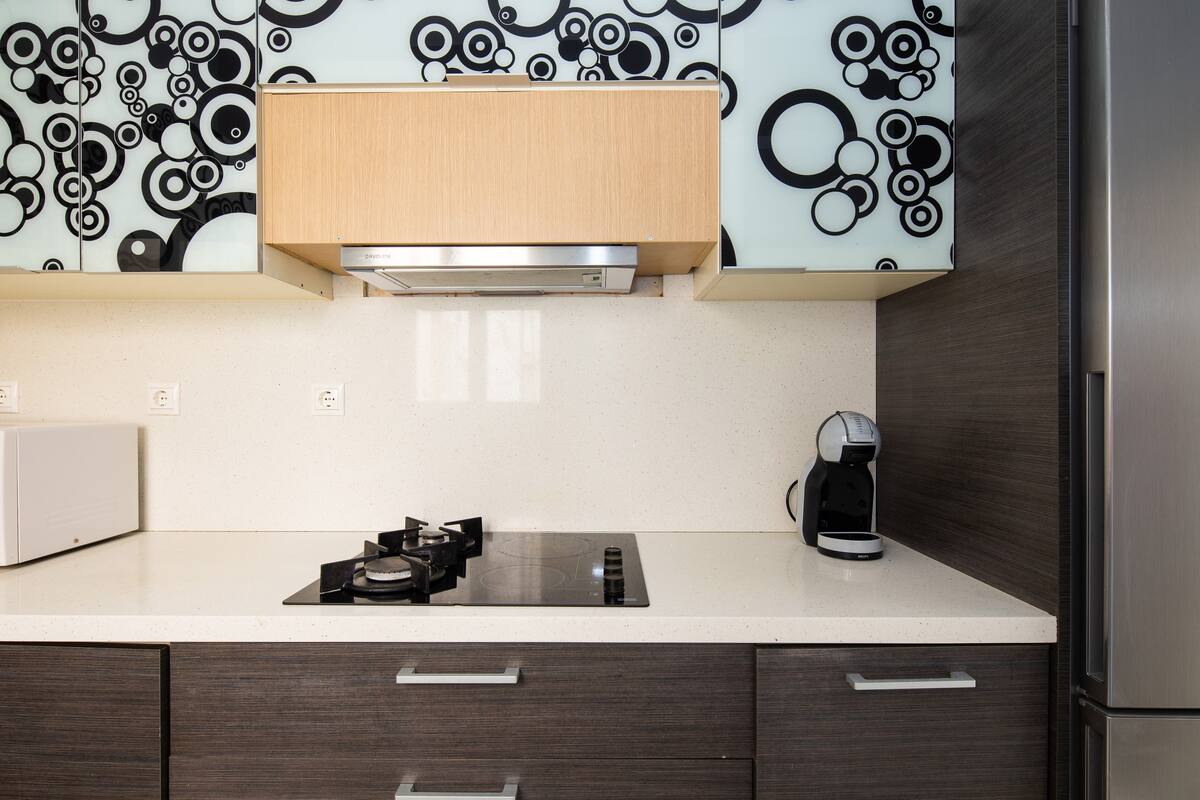 The bathroom includes a 2in1 shampoo/shower gel combo, hand soap, 1 bath towel and 1 guest towel per person. The kitchen includes a fridge/freezer, a microwave, gas hobs and a NESCAFÉ® Dolce Gusto coffee maker (capsules are not provided). Also included will be a starter pack of Greek coffee powder, sugar, salt, pepper and olive oil. In the summer months, blankets are not provided. Instead, we provide a sheet covering. This is common practice in Greece during the summer. The flat is equipped with A/C and a thermostat. In the wardrobe you ‘ll find hangers, an iron and a hair dryer. We have tested the WiFi 🛜 to a confirmed speed of up to 202Mbps.