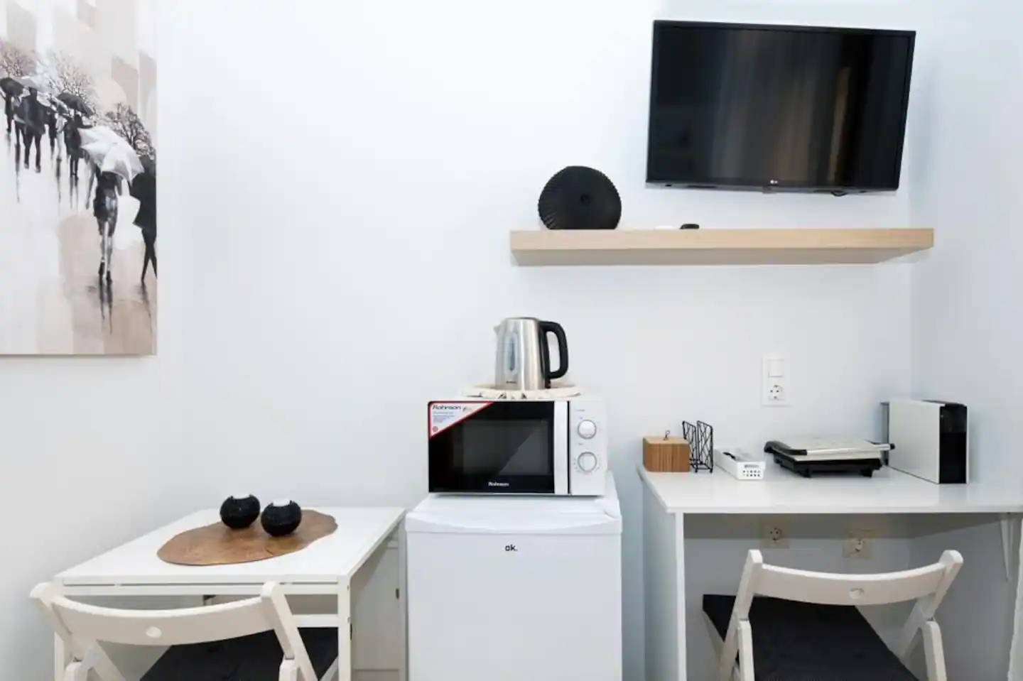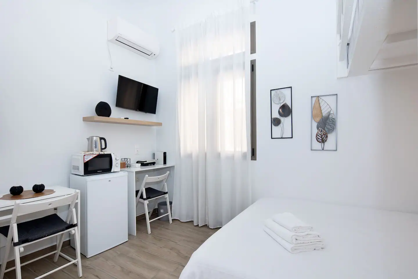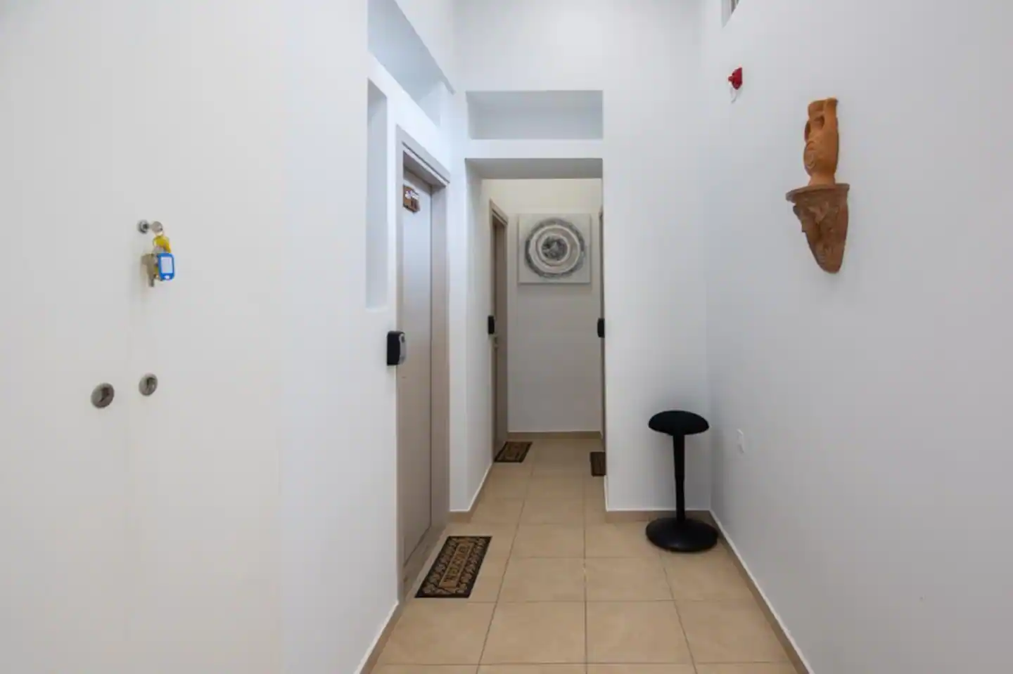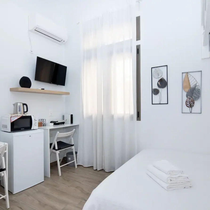 The bathroom has 24h hot water, a 2in1 shampoo/shower gel combo, hand soap, 1 bath towel and 1 guest towel per person. There is a fridge/freezer, a microwave, and a Nespresso® Original coffee maker (capsules are not provided). You will find Greek coffee powder, sugar, salt, pepper and olive oil in the communal kitchen on the rooftop. In the summer months, blankets are not provided. Instead, we provide a sheet covering. This is common practice in Greece during the summer. The flat is equipped with A/C. In the wardrobe you ‘ll find hangers, an iron and a hair dryer. We have tested the WiFi 🛜 to a confirmed speed of up to 86Mbps.