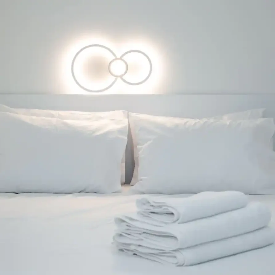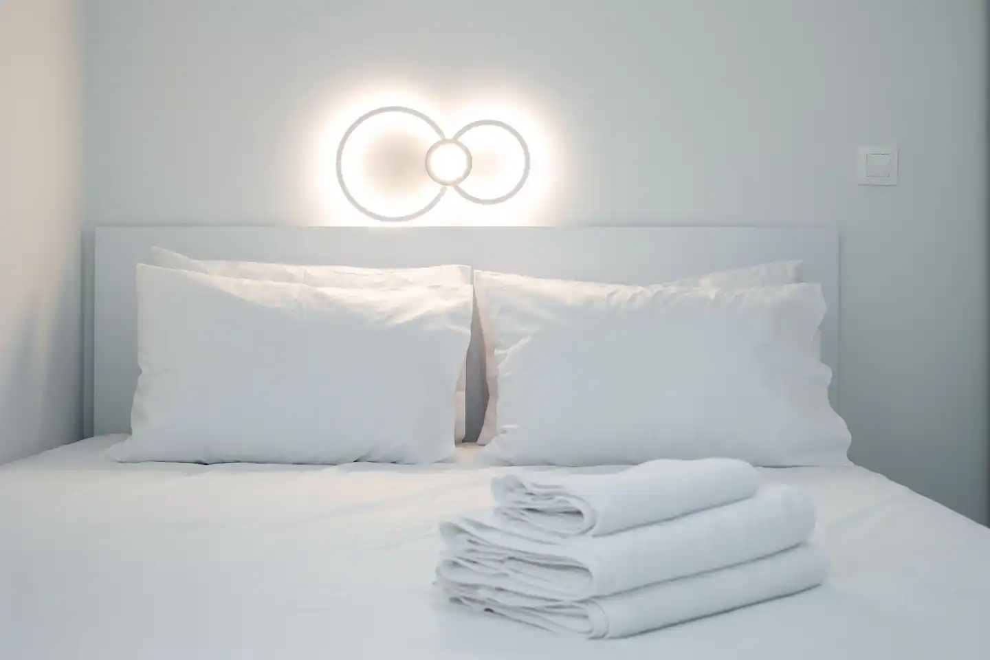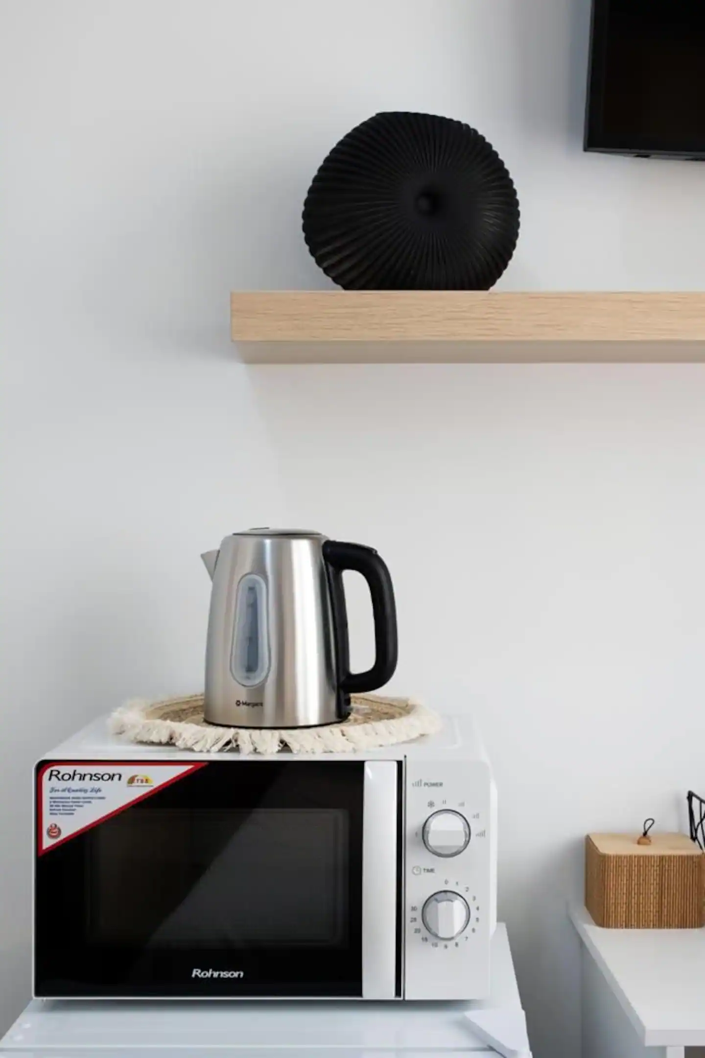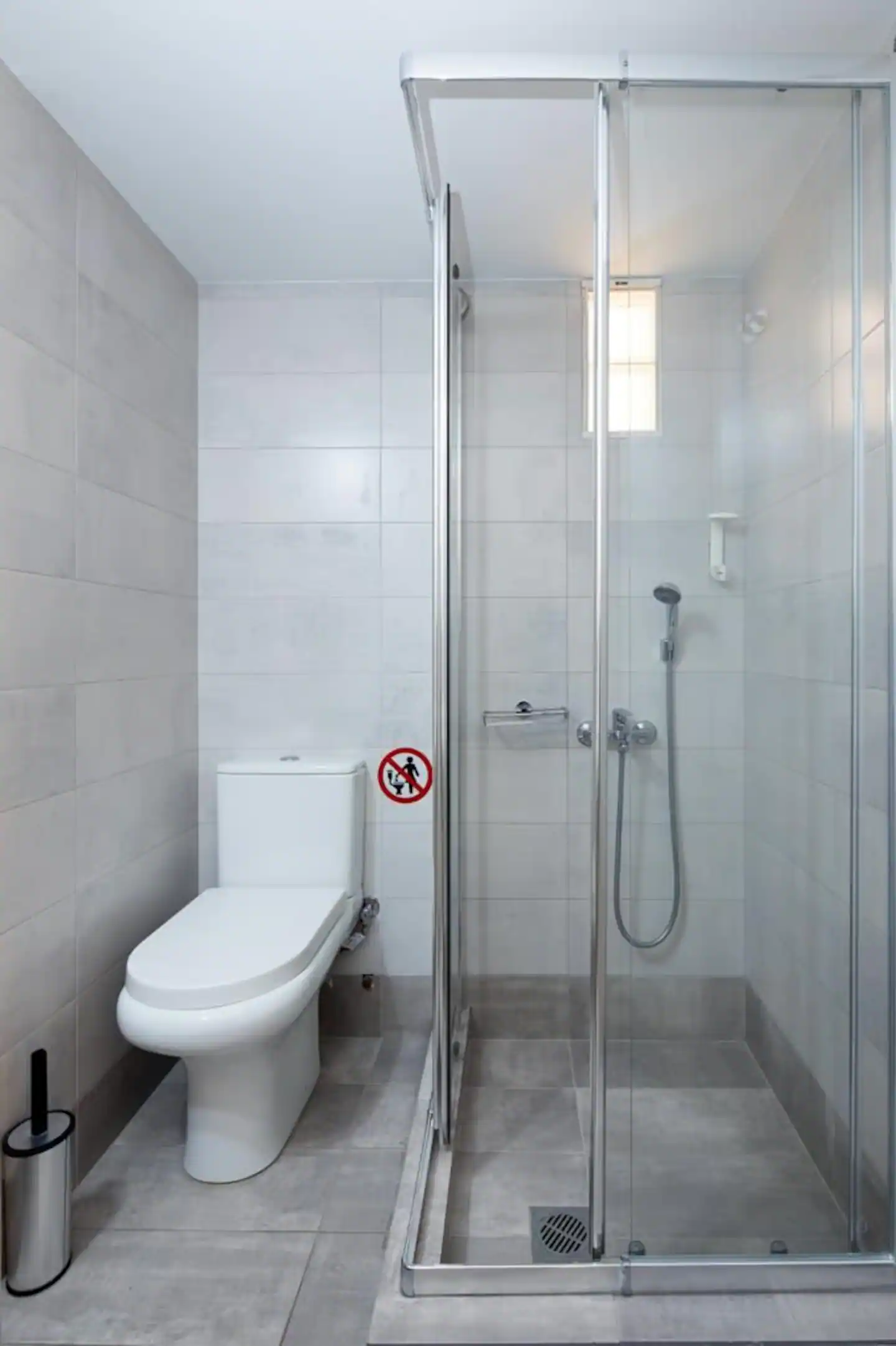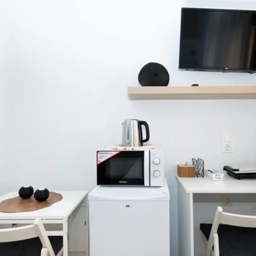 The bathroom has 24h hot water, a 2in1 shampoo/shower gel combo, hand soap, 1 bath towel and 1 guest towel per person. There is a fridge/freezer, a microwave, and a Nespresso® Original coffee maker (capsules are not provided). You will find Greek coffee powder, sugar, salt, pepper and olive oil in the communal kitchen on the rooftop. In the summer months, blankets are not provided. Instead, we provide a sheet covering. This is common practice in Greece during the summer. The flat is equipped with A/C. In the wardrobe you ‘ll find hangers, an iron and a hair dryer. We have tested the WiFi 🛜 to a confirmed speed of up to 86Mbps.