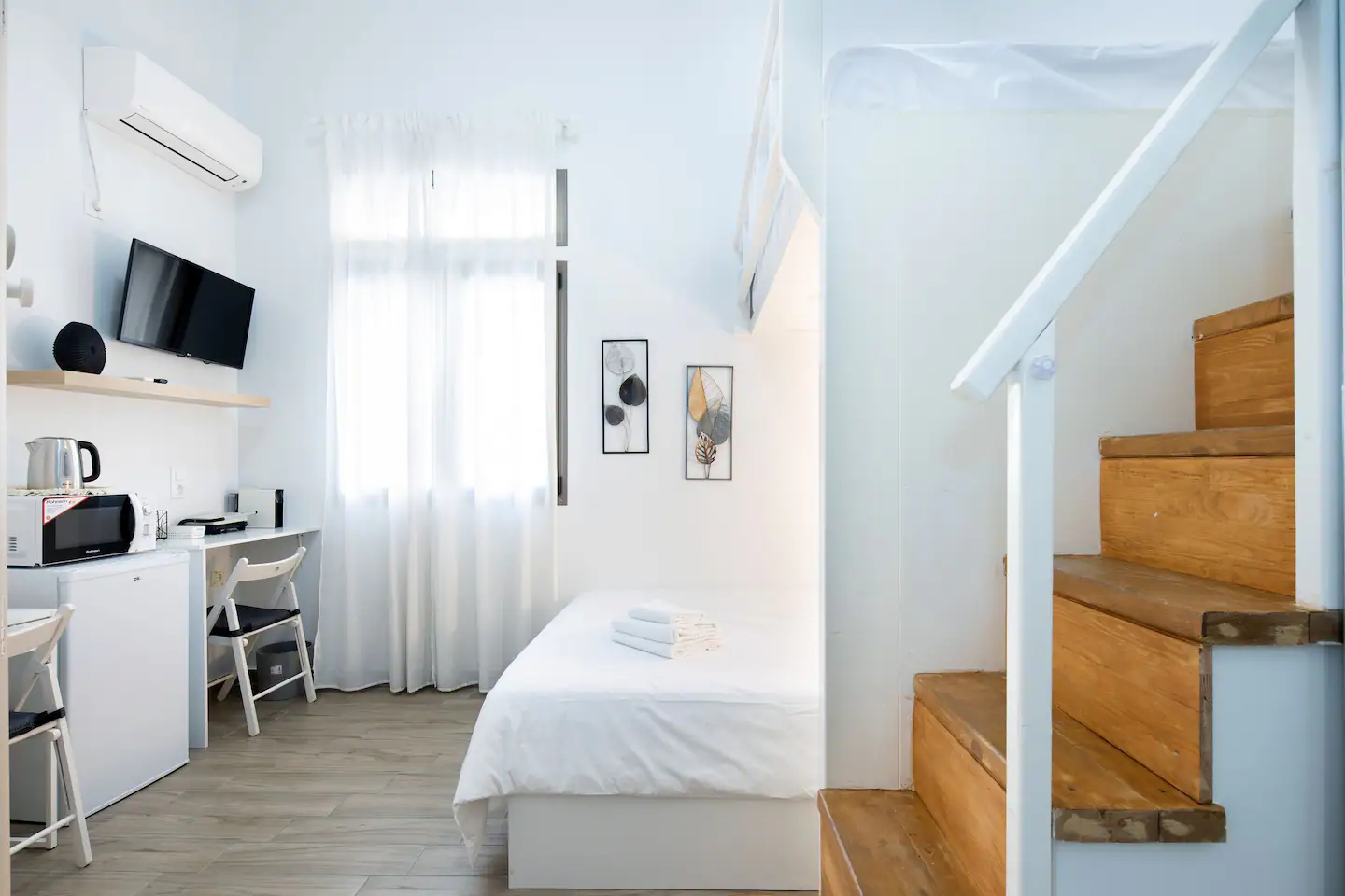 Studio apartment on the ground floor in the Kerameikos area featuring one King-sized bed (and another small double bed overhead on the mezzanine) and a fully equipped bathroom. There ‘s an HDTV (streaming service accounts not provided) and suitable sleeping space for up to 4 people. Only a short walk from Ermou, Monastiraki & Thissio.