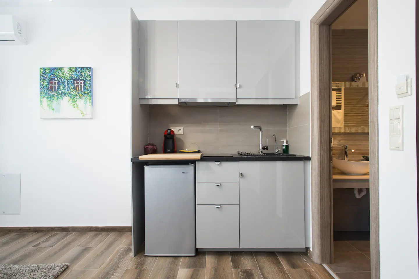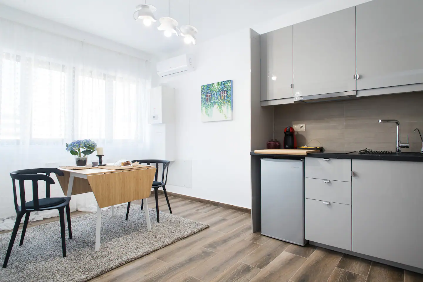 The bathroom has 24h hot water, a 2in1 shampoo/shower gel combo, hand soap, 1 bath towel and 1 guest towel per person. The kitchen includes a fridge/freezer, a microwave, electric hobs and a NESCAFÉ® Dolce Gusto coffee maker (capsules are not provided). Also included will be a starter pack of Greek coffee powder, sugar, salt, pepper and olive oil. In the summer months, blankets are not provided. Instead, we provide a sheet covering. This is common practice in Greece during the summer. The flat is equipped with A/C and a thermostat. In the wardrobe you ‘ll find hangers, an iron and a hair dryer. We have tested the WiFi 🛜 to a confirmed speed of up to 15Mbps.