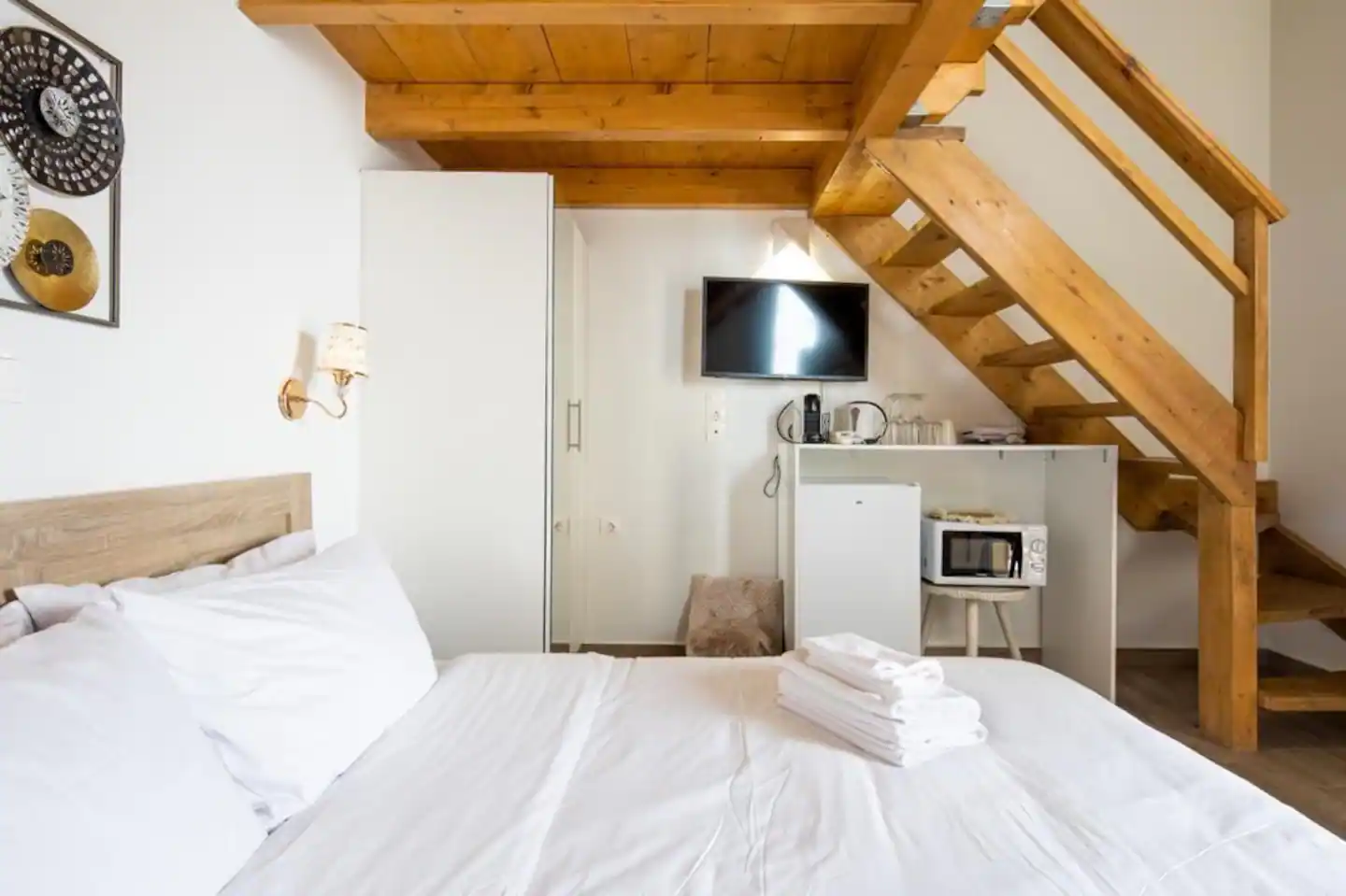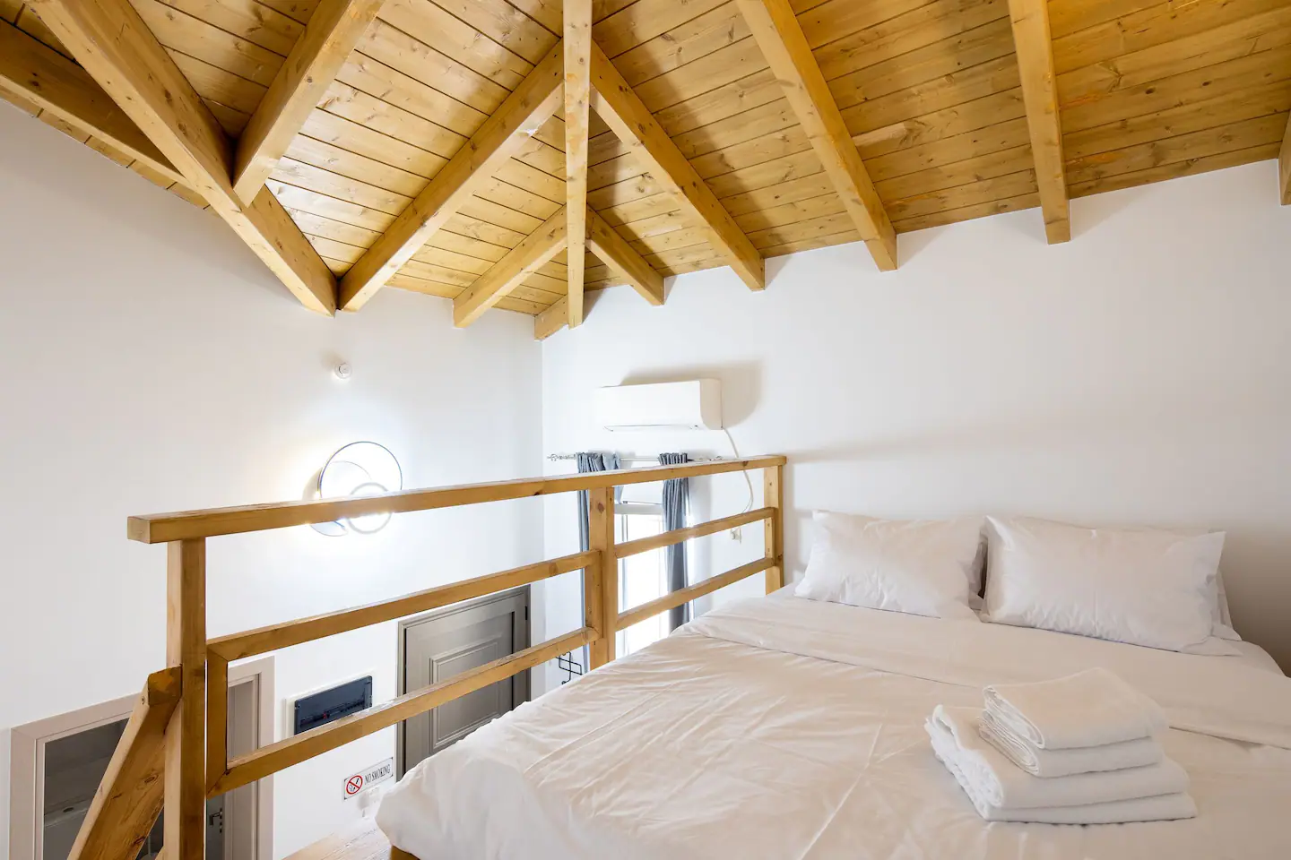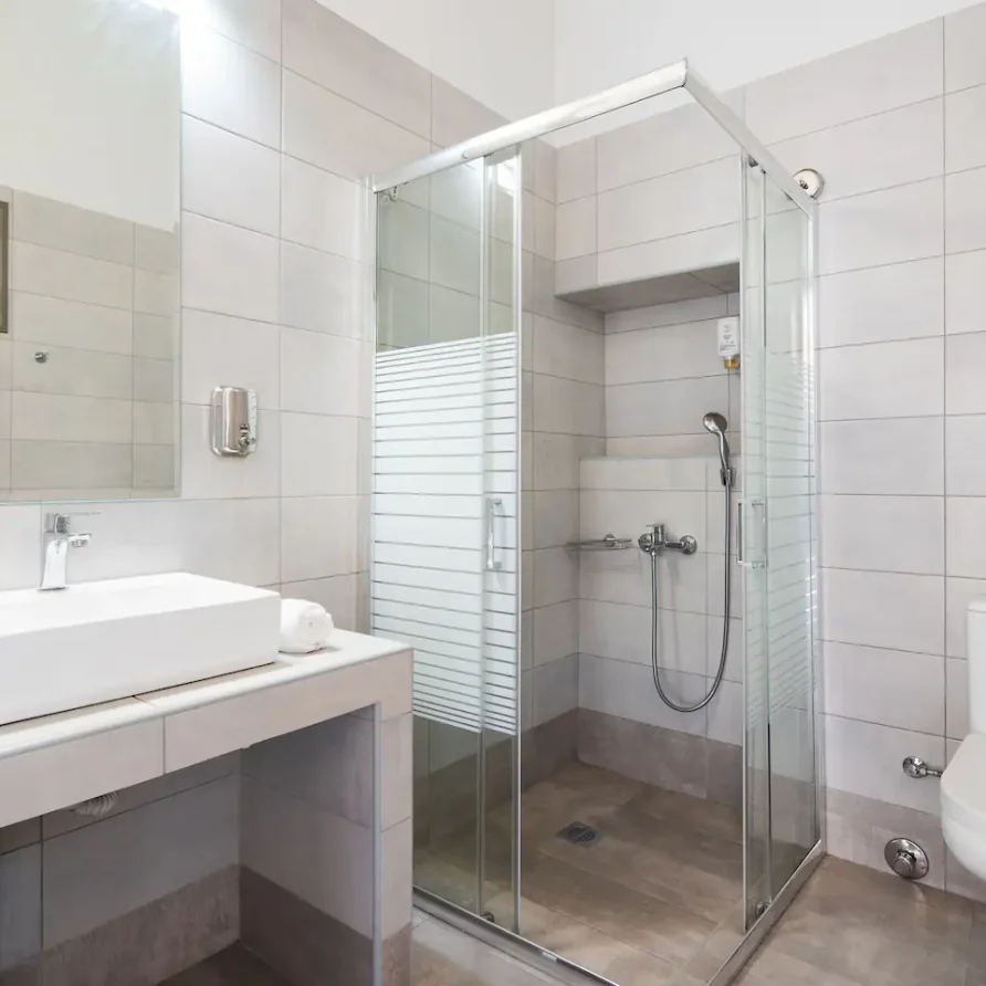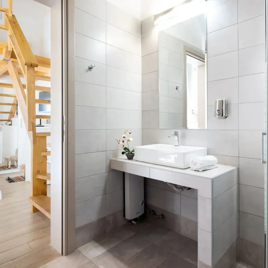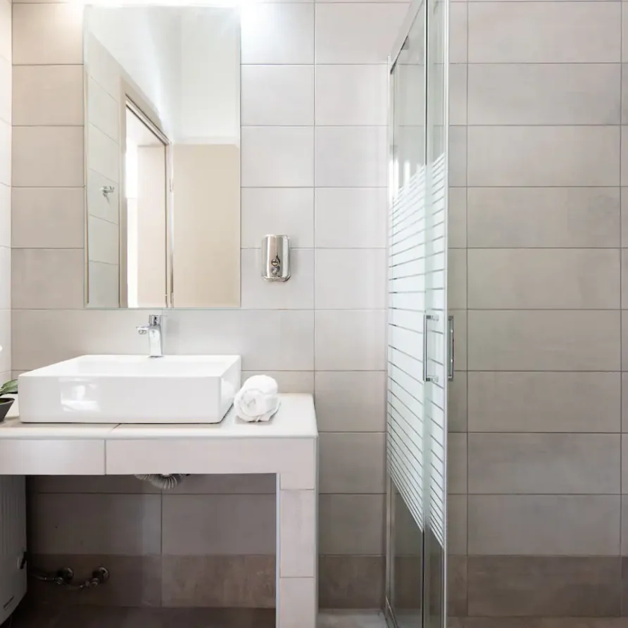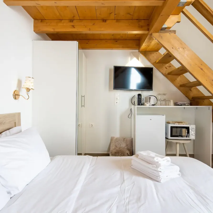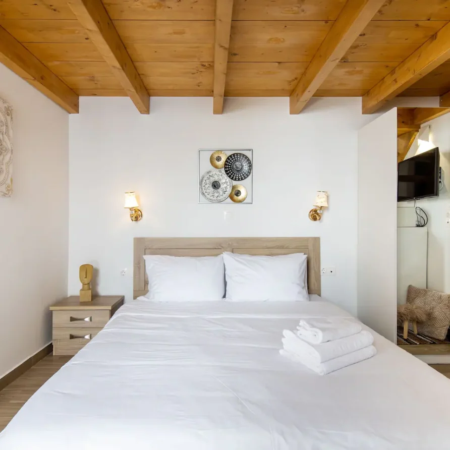 The bathroom has 24h hot water, a 2in1 shampoo/shower gel combo, hand soap, 1 bath towel and 1 guest towel per person. There is a fridge/freezer, a microwave, and a Nespresso® Original coffee maker (capsules are not provided). You will find Greek coffee powder, sugar, salt, pepper and olive oil in the communal kitchen on the rooftop. In the summer months, blankets are not provided. Instead, we provide a sheet covering. This is common practice in Greece during the summer. The flat is equipped with A/C. In the wardrobe you ‘ll find hangers, an iron and a hair dryer. We have tested the WiFi 🛜 to a confirmed speed of up to 143Mbps.