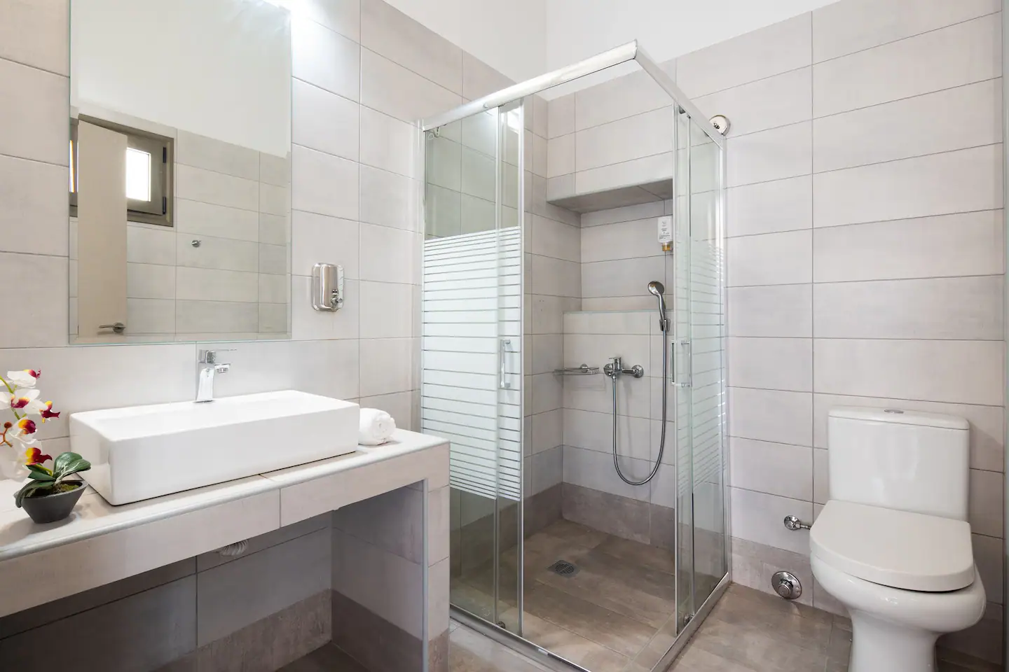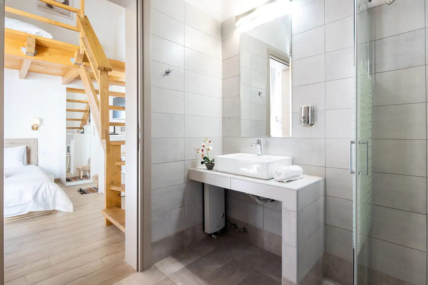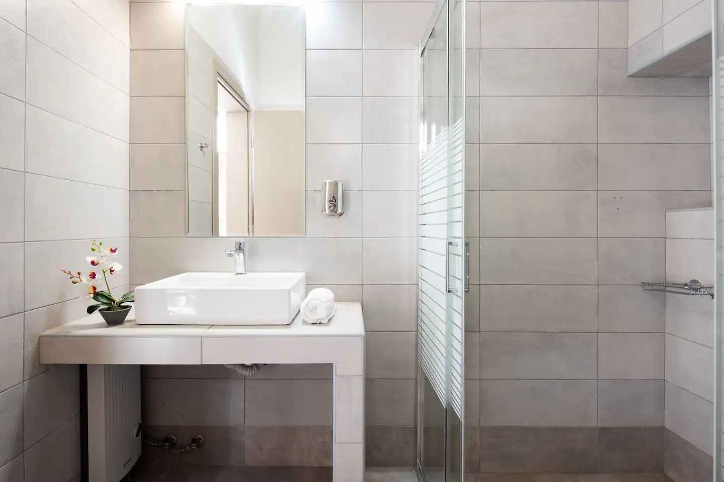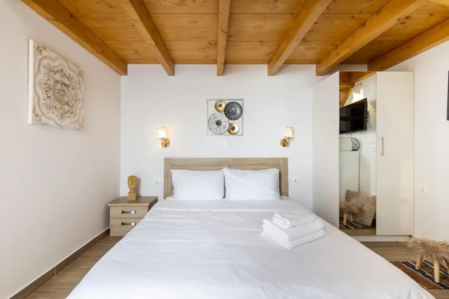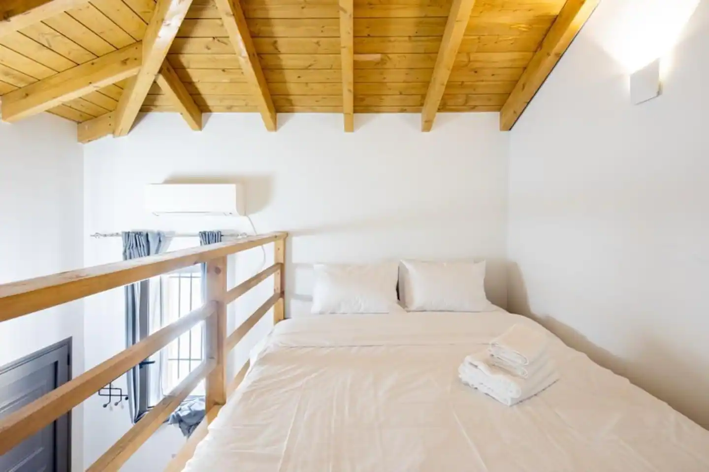 The bathroom has 24h hot water, a 2in1 shampoo/shower gel combo, hand soap, 1 bath towel and 1 guest towel per person. There is a fridge/freezer, a microwave, and a Nespresso® Original coffee maker (capsules are not provided). You will find Greek coffee powder, sugar, salt, pepper and olive oil in the communal kitchen on the rooftop. In the summer months, blankets are not provided. Instead, we provide a sheet covering. This is common practice in Greece during the summer. The flat is equipped with A/C. In the wardrobe you ‘ll find hangers, an iron and a hair dryer. We have tested the WiFi 🛜 to a confirmed speed of up to 143Mbps.