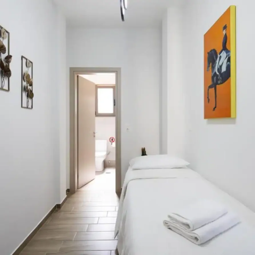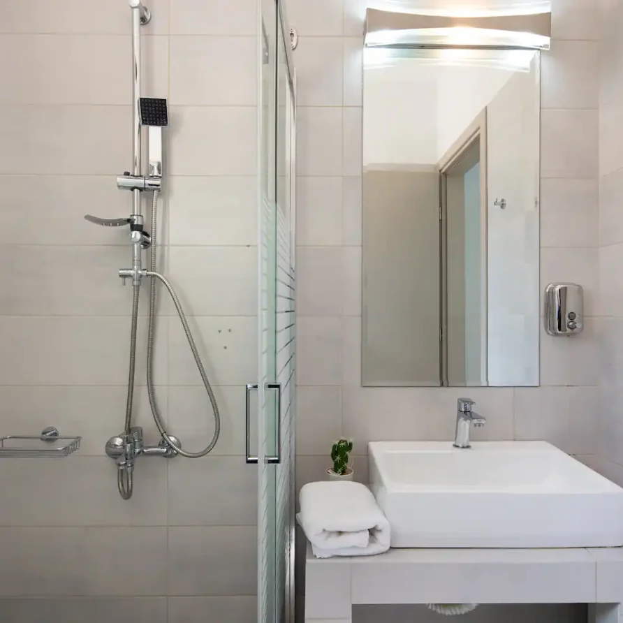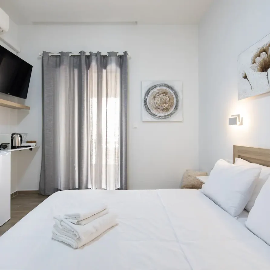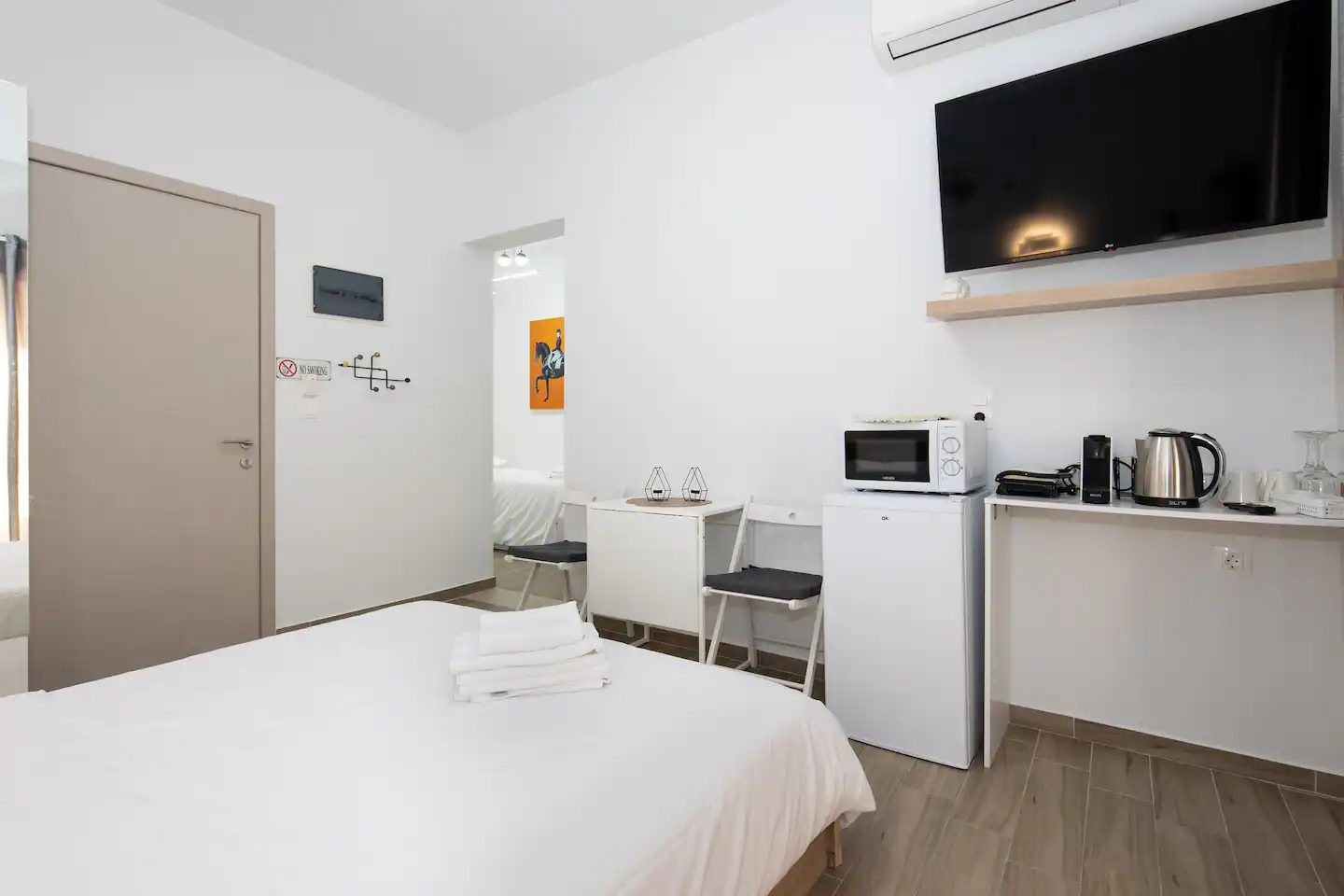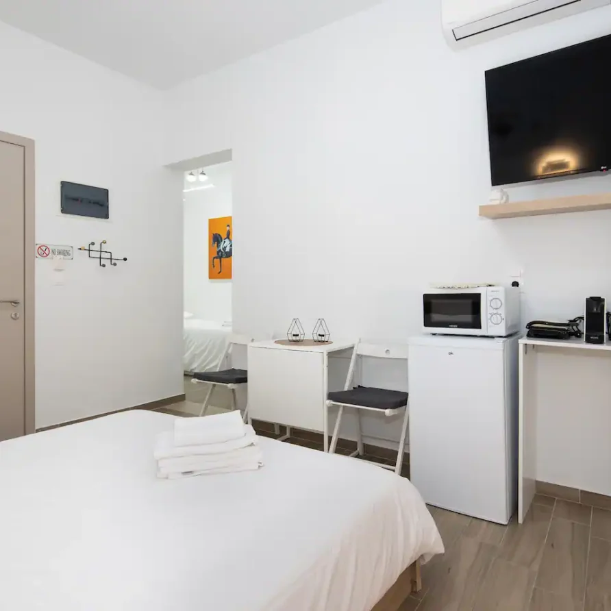 The bathroom has 24h hot water, a 2in1 shampoo/shower gel combo, hand soap, 1 bath towel and 1 guest towel per person. There is a fridge/freezer, a microwave, and a Nespresso® Original coffee maker (capsules are not provided). You will find Greek coffee powder, sugar, salt, pepper and olive oil in the communal kitchen on the rooftop. In the summer months, blankets are not provided. Instead, we provide a sheet covering. This is common practice in Greece during the summer. The flat is equipped with A/C. In the wardrobe you ‘ll find hangers, an iron and a hair dryer. We have tested the WiFi 🛜 to a confirmed speed of up to 157Mbps.