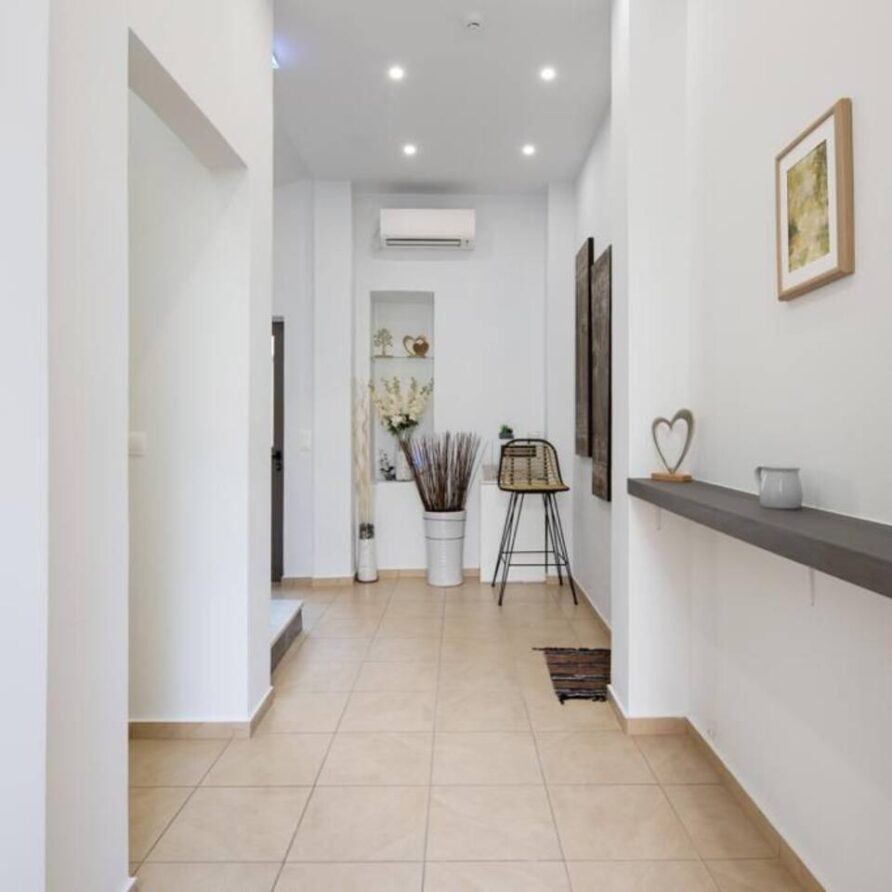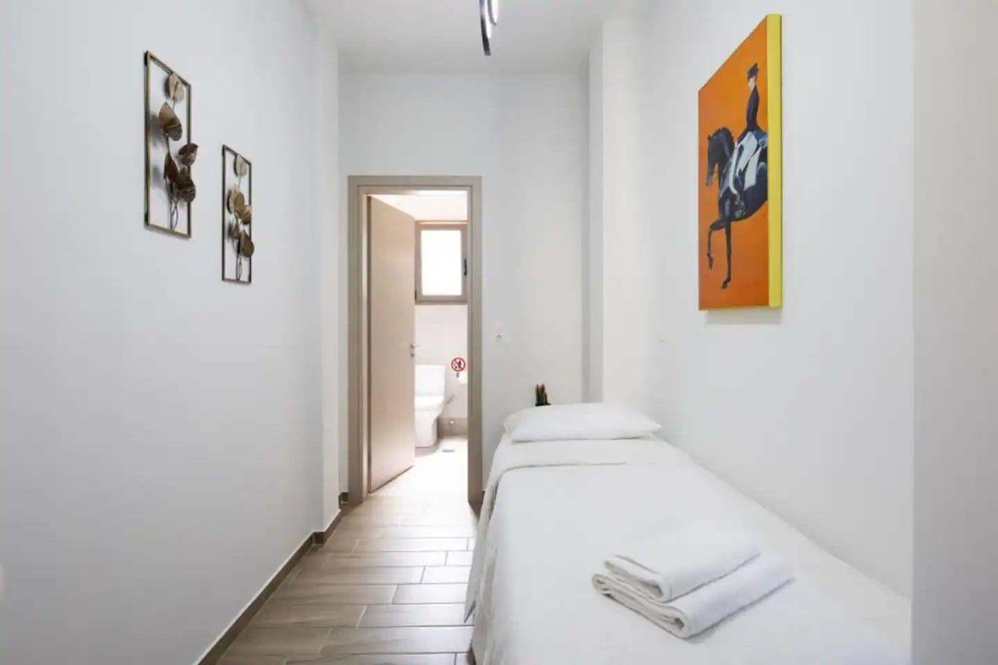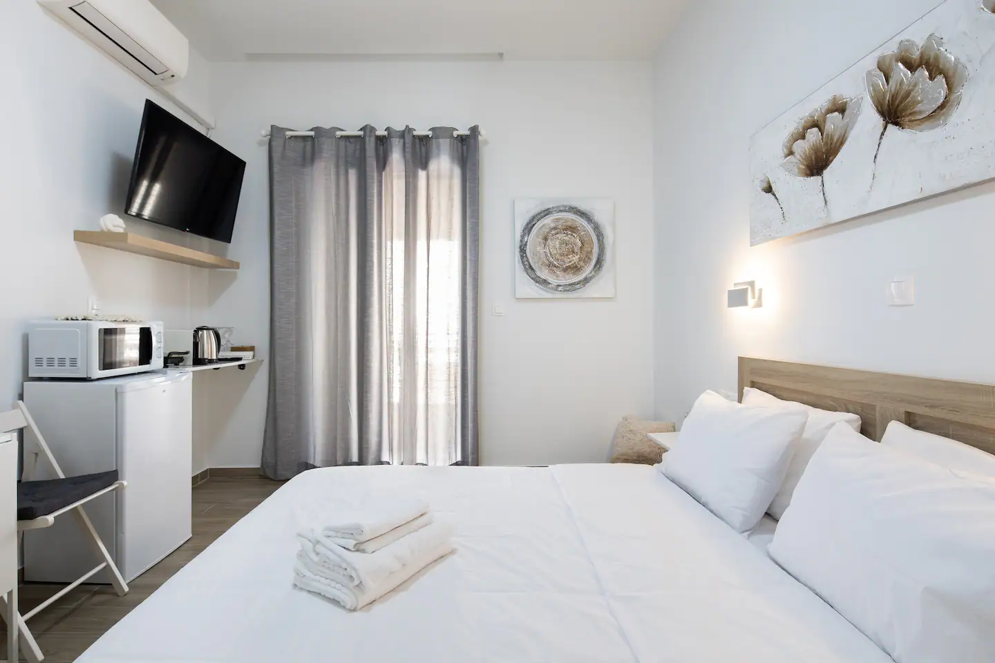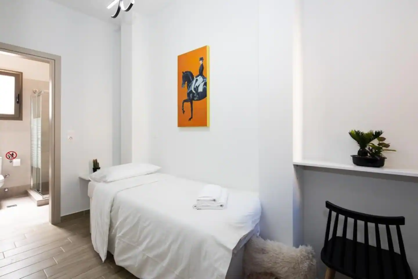 The bathroom has 24h hot water, a 2in1 shampoo/shower gel combo, hand soap, 1 bath towel and 1 guest towel per person. There is a fridge/freezer, a microwave, and a Nespresso® Original coffee maker (capsules are not provided). You will find Greek coffee powder, sugar, salt, pepper and olive oil in the communal kitchen on the rooftop. In the summer months, blankets are not provided. Instead, we provide a sheet covering. This is common practice in Greece during the summer. The flat is equipped with A/C. In the wardrobe you ‘ll find hangers, an iron and a hair dryer. We have tested the WiFi 🛜 to a confirmed speed of up to 157Mbps.