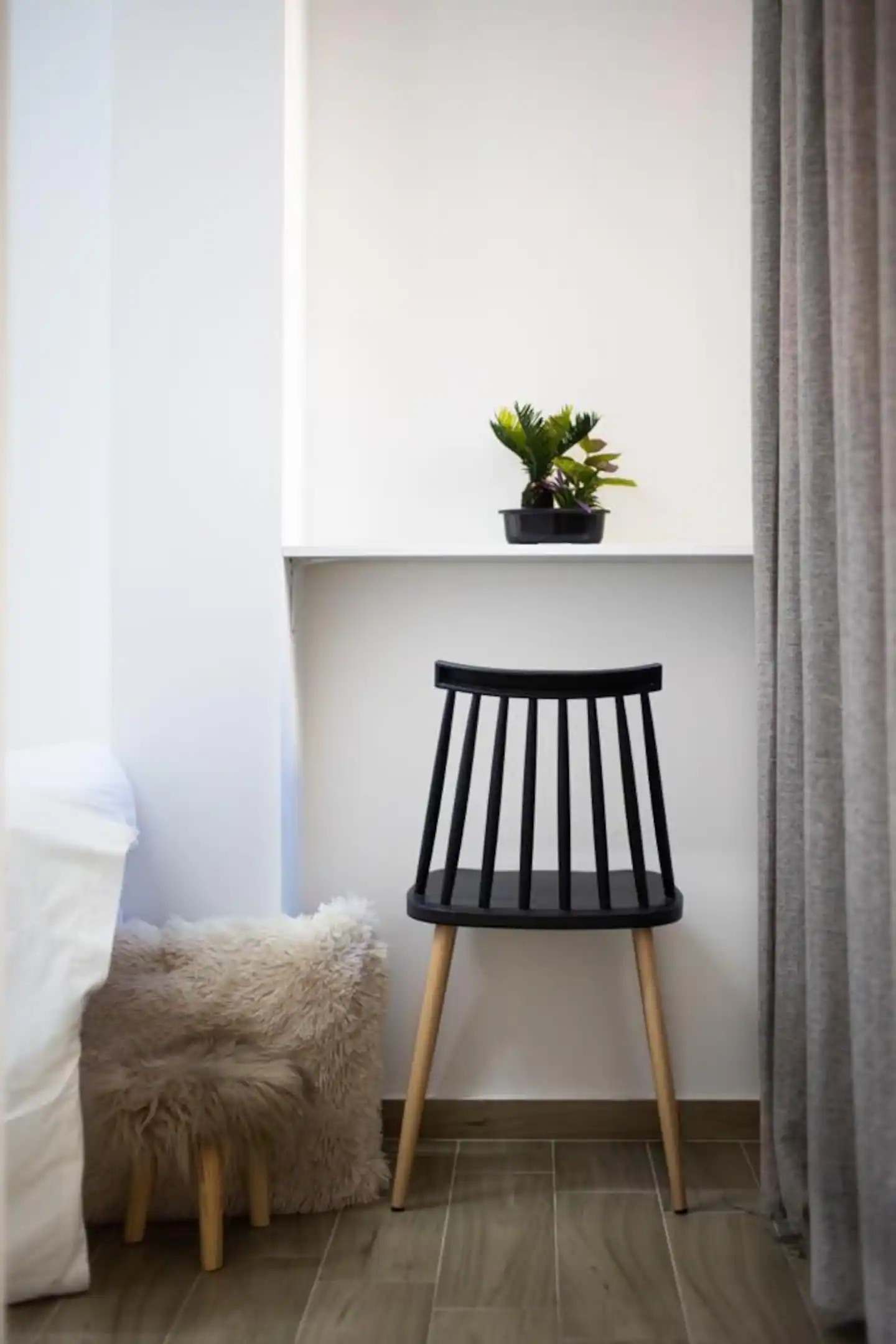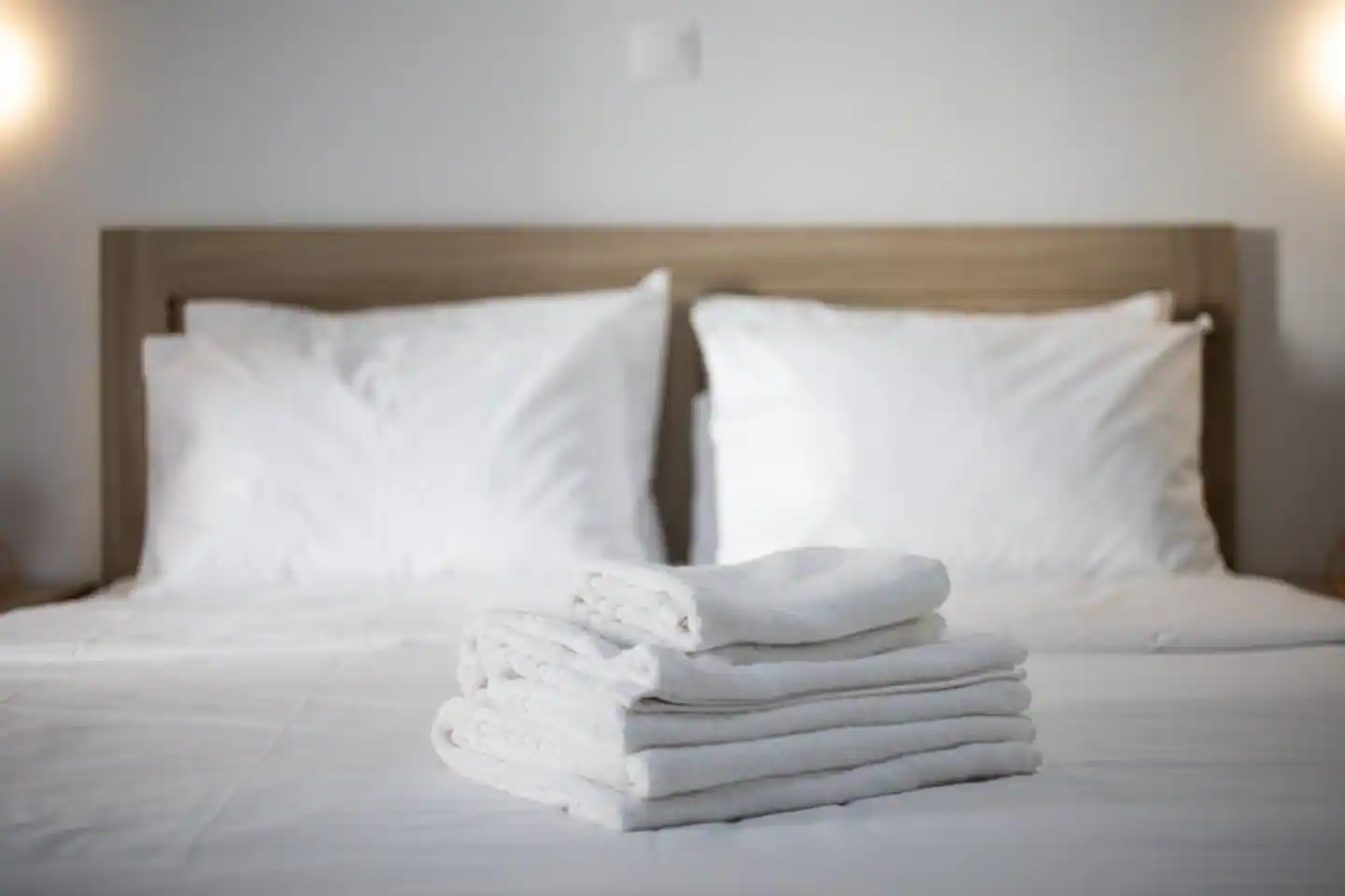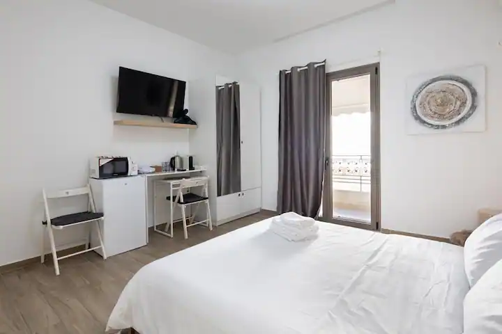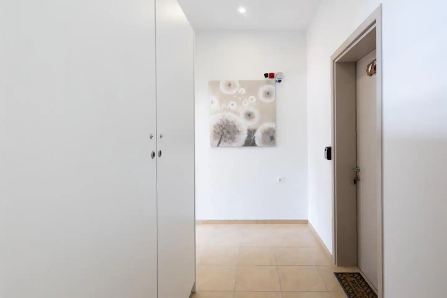 The bathroom has 24h hot water, a 2in1 shampoo/shower gel combo, hand soap, 1 bath towel and 1 guest towel per person. There is a fridge/freezer, a microwave, and a Nespresso® Original coffee maker (capsules are not provided). You will find Greek coffee powder, sugar, salt, pepper and olive oil in the communal kitchen on the rooftop. In the summer months, blankets are not provided. Instead, we provide a sheet covering. This is common practice in Greece during the summer. The flat is equipped with A/C. In the wardrobe you ‘ll find hangers, an iron and a hair dryer. We have tested the WiFi 🛜 to a confirmed speed of up to 157Mbps.